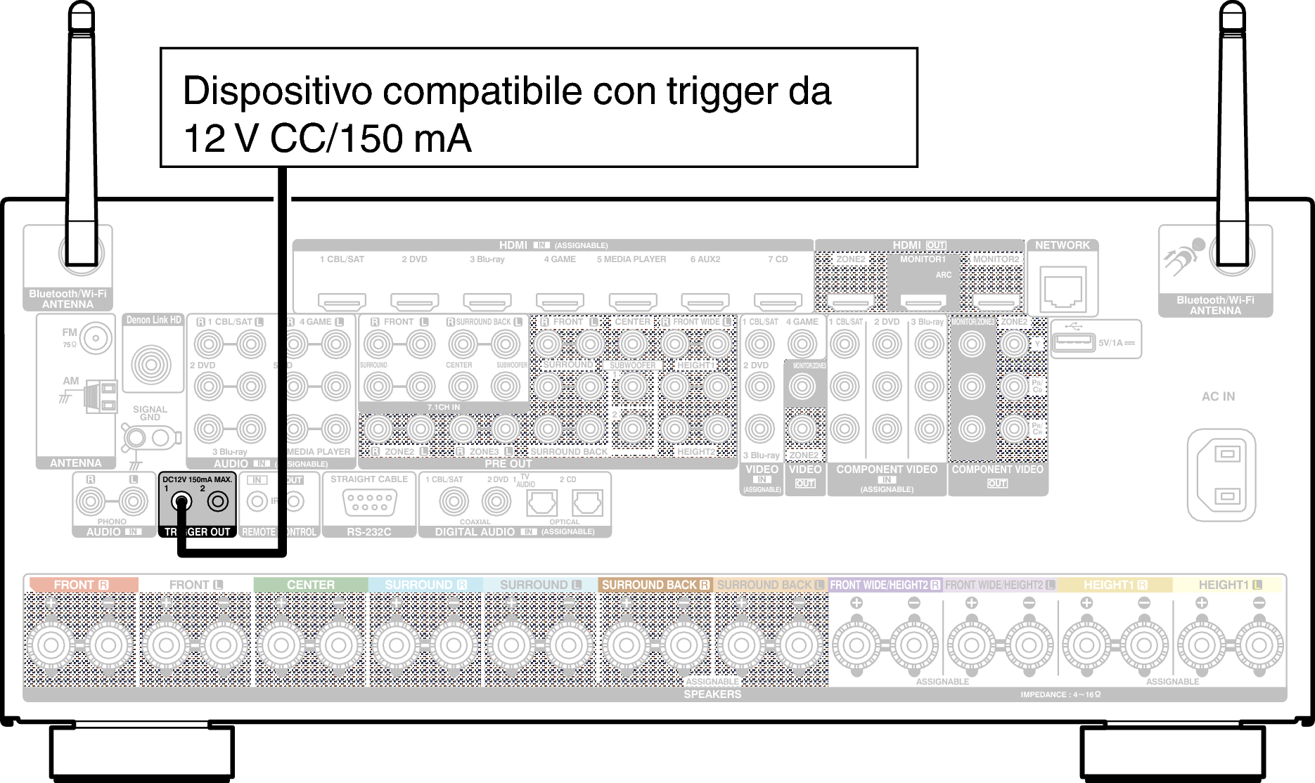 La presa TRIGGER OUT emette un segnale elettrico di massimo 12 V CC/150 mA.