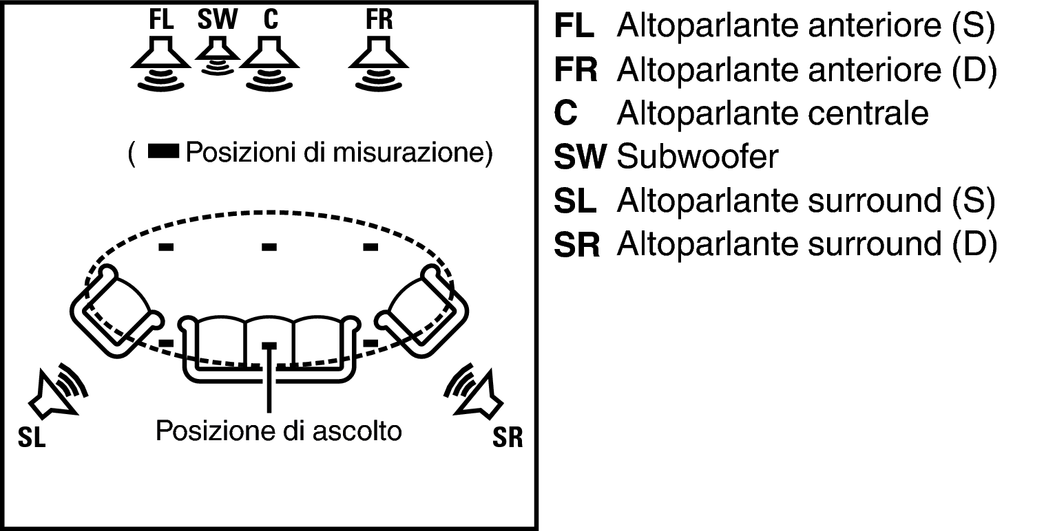 Durante le misurazioni dagli altoparlanti e dai subwoofer potrebbero essere riprodotti toni di test. Tale fenomeno rientra nei normali parametri di funzionamento. In caso di rumori di fondo nella stanza, il volume dei segnali di test subirà un incremento.