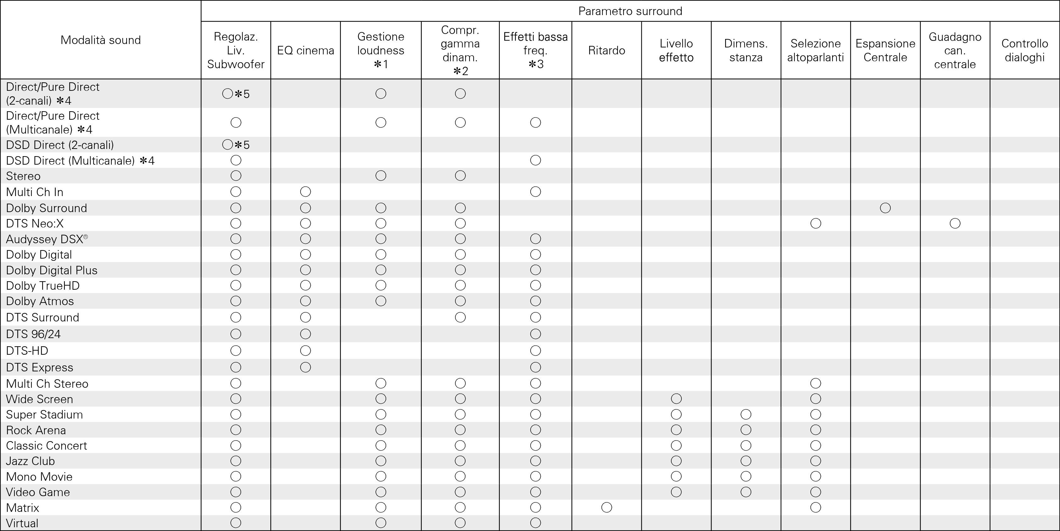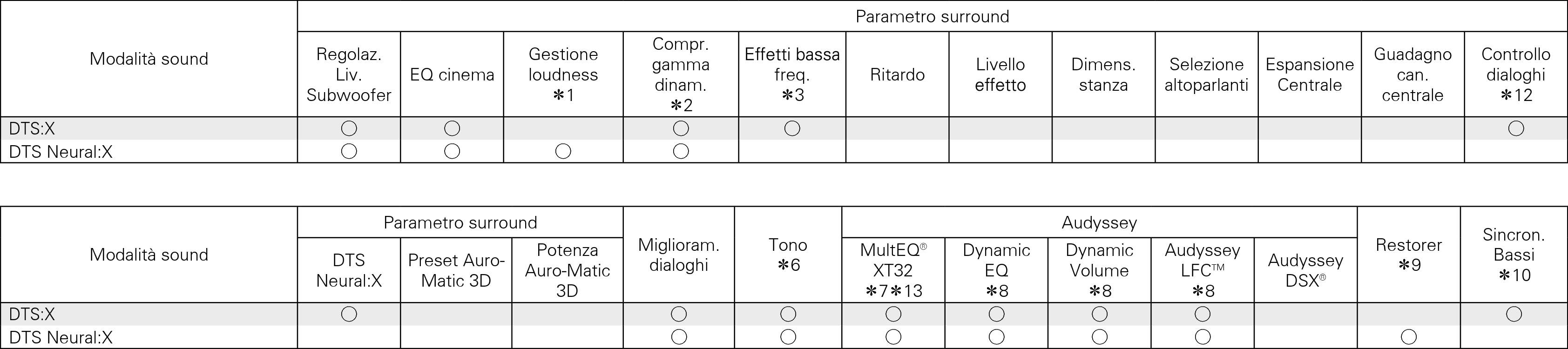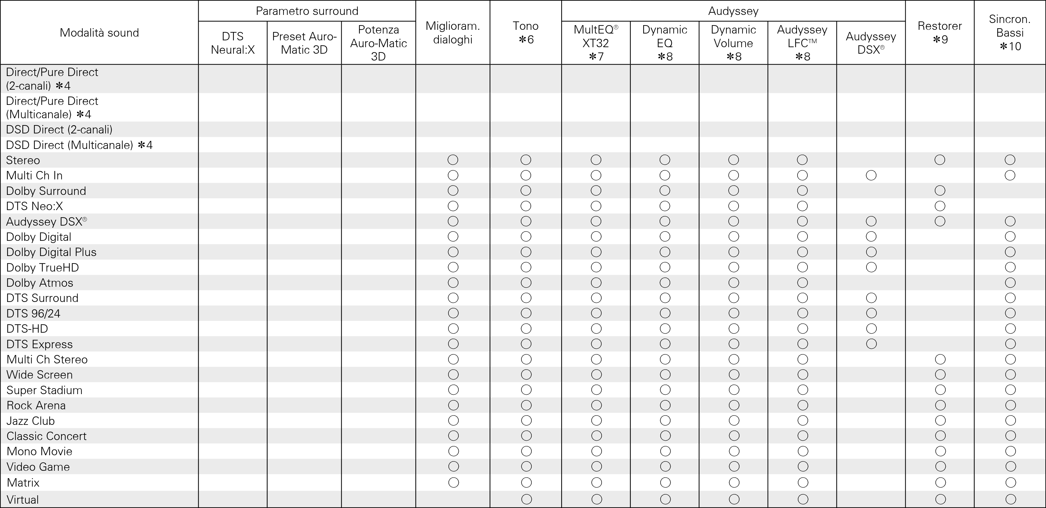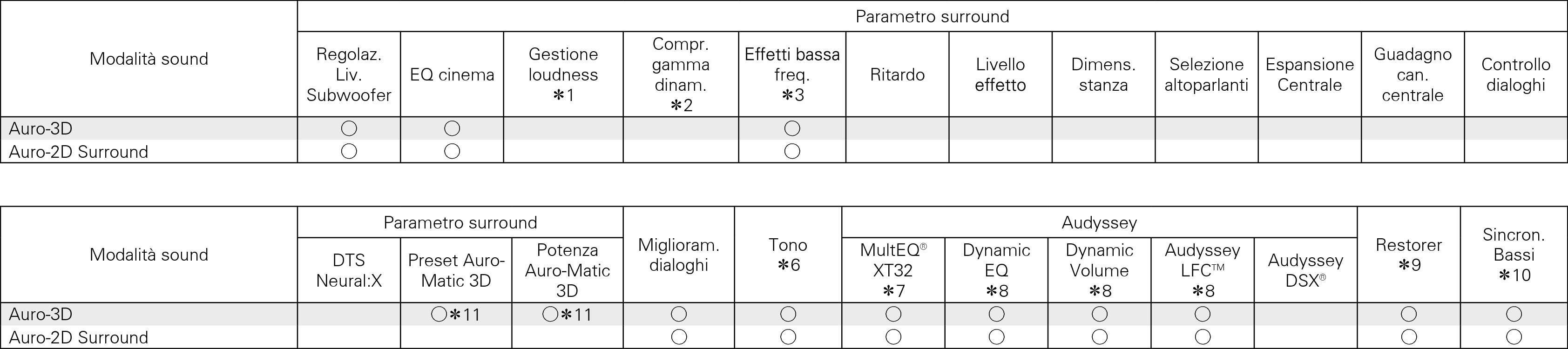 ∗1 – ∗3, ∗6 – ∗11 : Modalità sound e parametri surroundlink