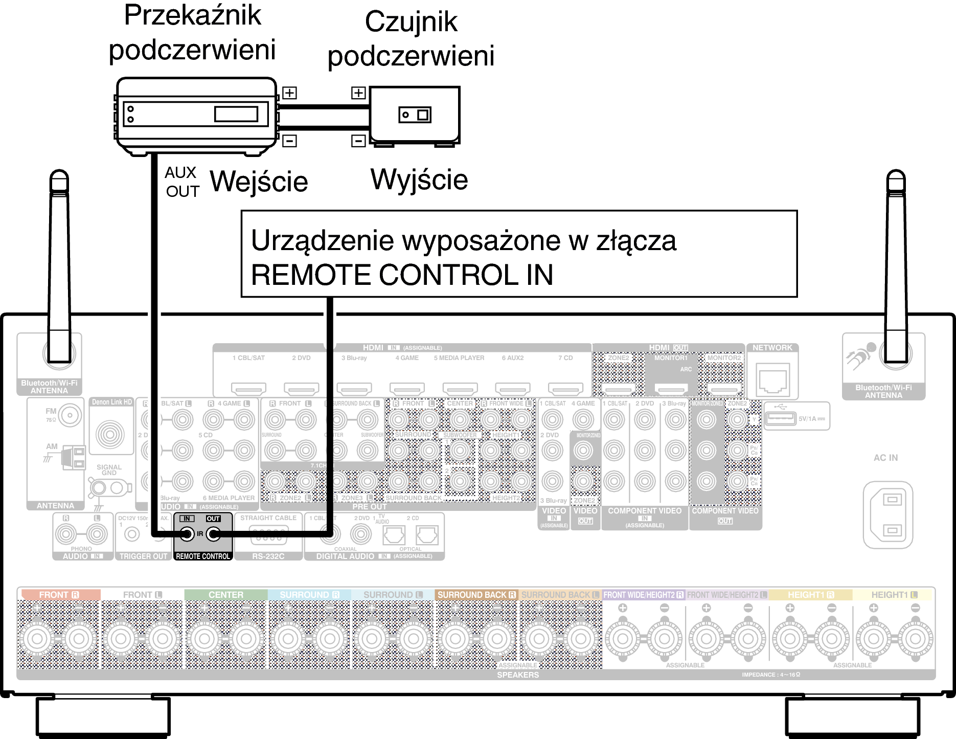 Gdy urządzenie jest zainstalowane w miejscu poza zasięgiem sygnału z pilota zdalnego sterowania (instalacja w szafce itp.), sterowanie pilotem jest nadal możliwe przy użyciu odbiornika zdalnego sterowania (sprzedawanego oddzielnie).