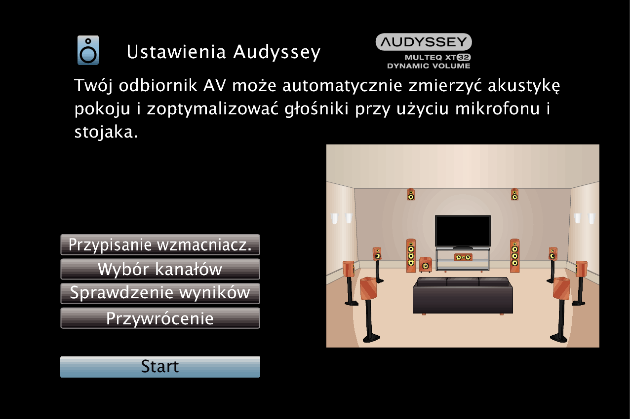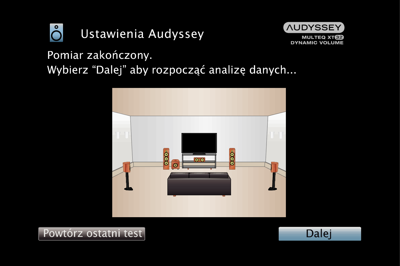 Nie należy zmieniać podłączenia głośnika ani głośności subwoofera po instalacji Audyssey®. Jeśli zostały zmienione, należy ponownie przeprowadzić instalację Audyssey®, aby skonfigurować optymalne ustawienia korektora.