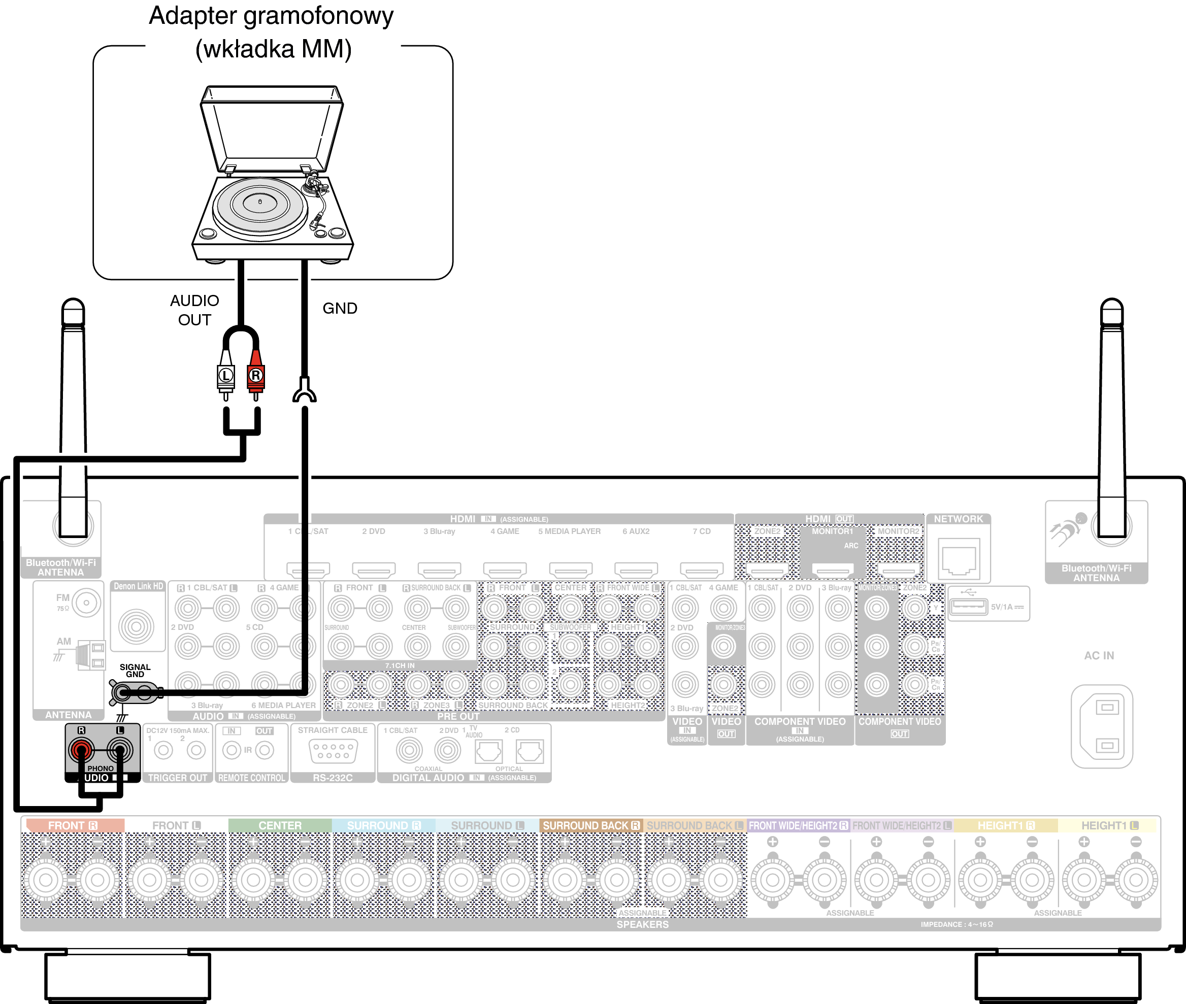 W przypadku wyboru źródła dźwięku “Phono” i zwiększenia głośności gdy gramofon nie jest podłączony, słyszalny może być przydźwięk.