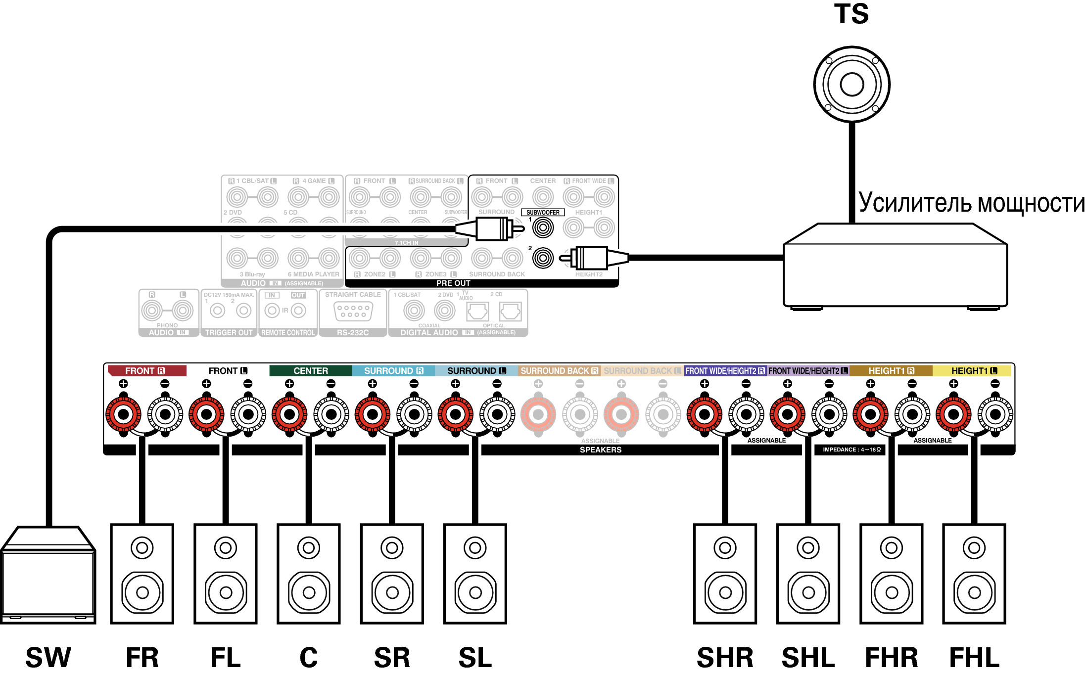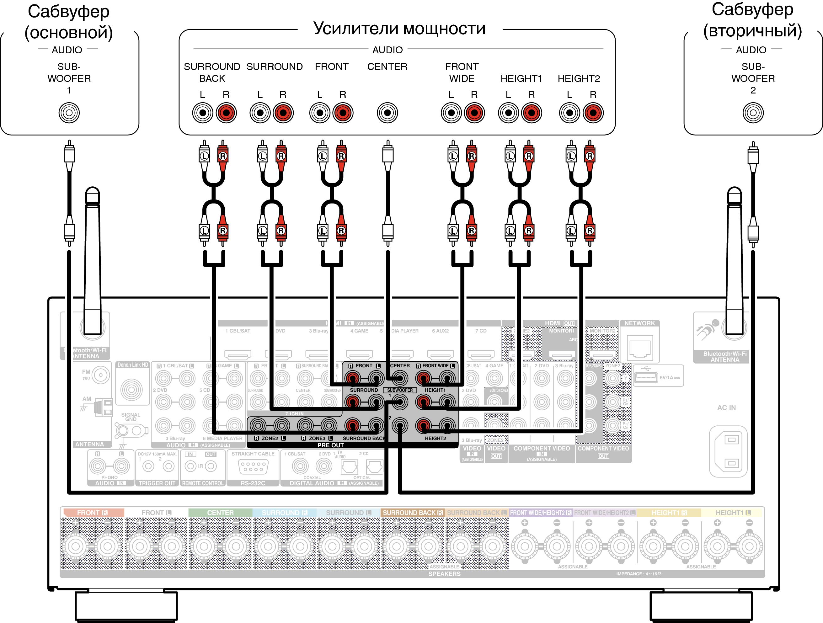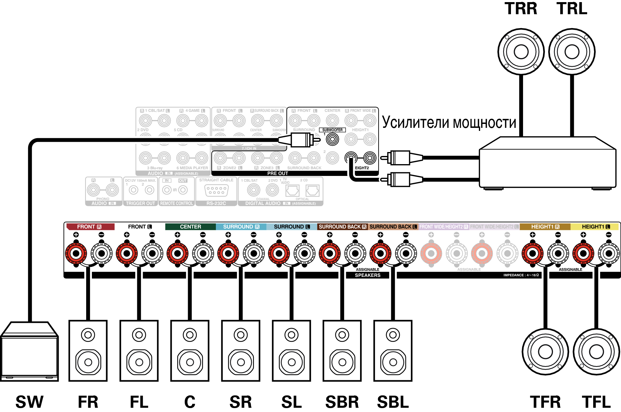Данная системная конфигурация воспроизводит 11.1 каналов с помощью внешнего усилителя мощности.