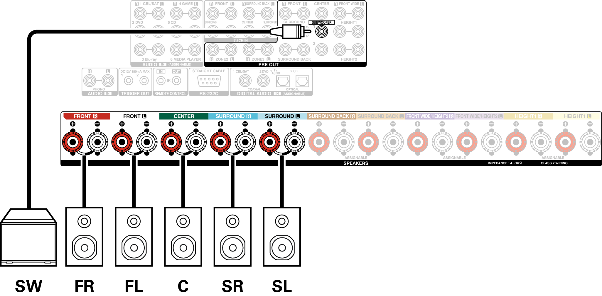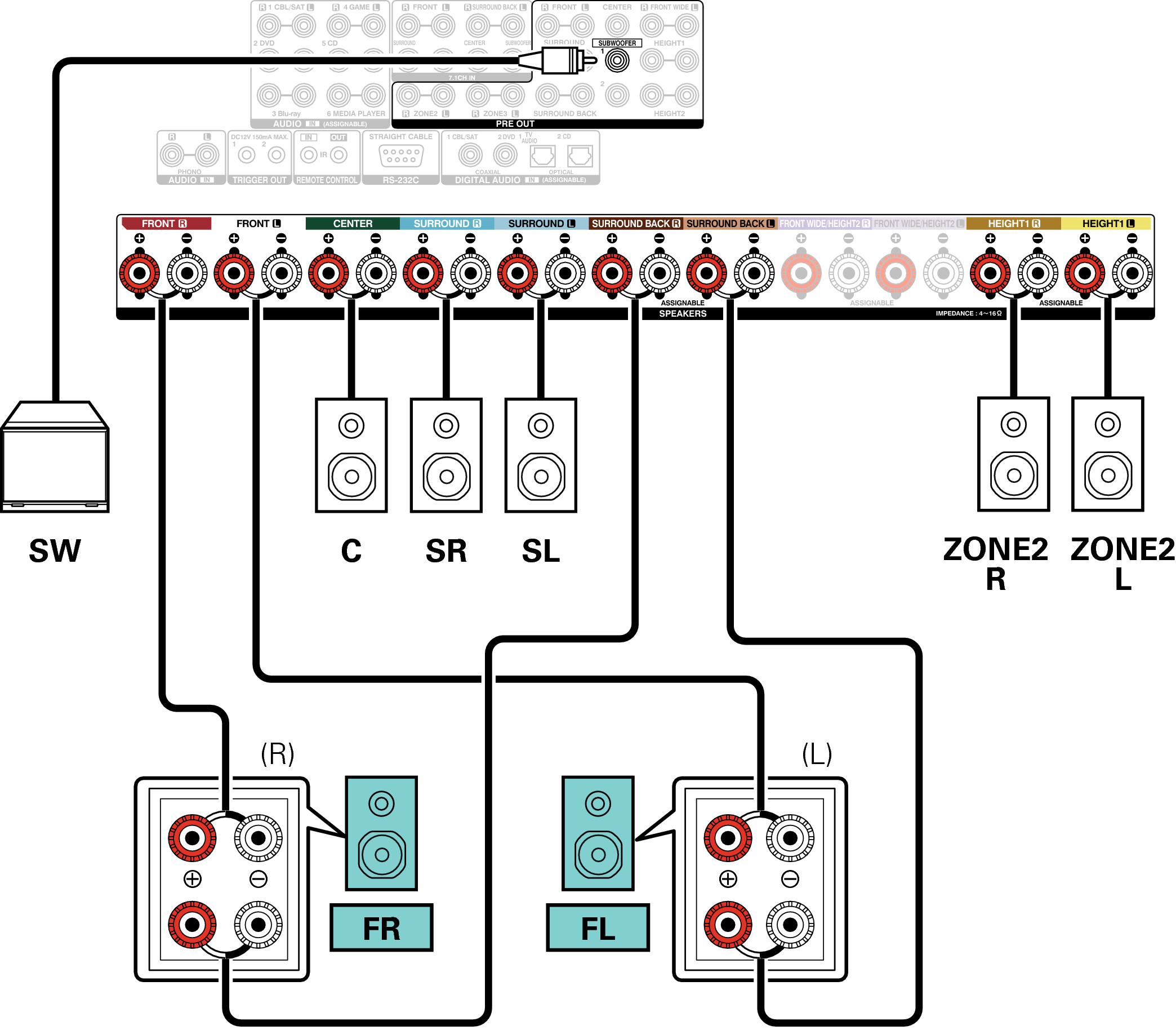 Данный тип конфигурации проигрывает 5.1 каналов в MAIN ZONE и 2 канала в ZONE2. Вы можете использовать подключение с двухполосным усилением для передних динамиков в MAIN ZONE.