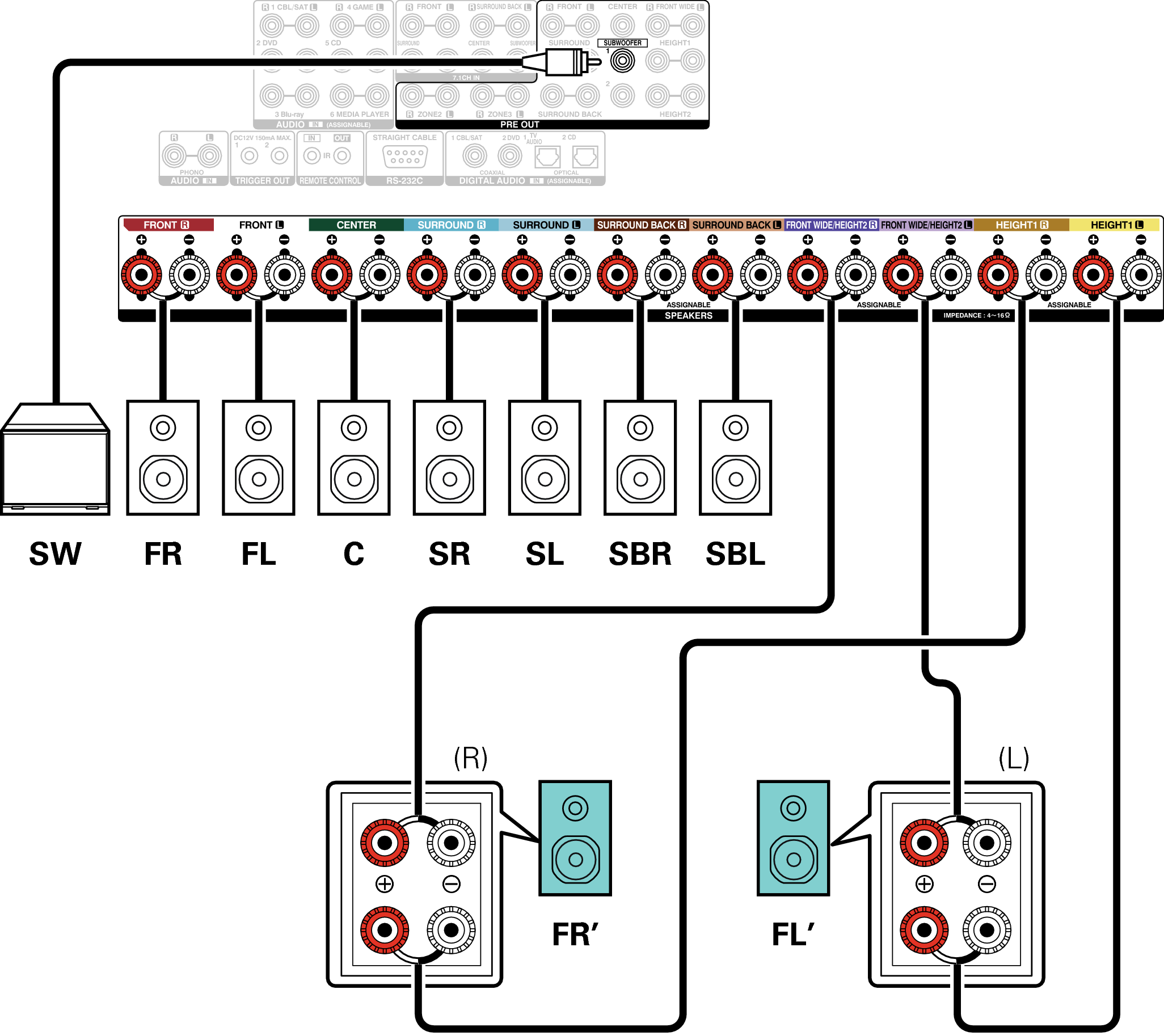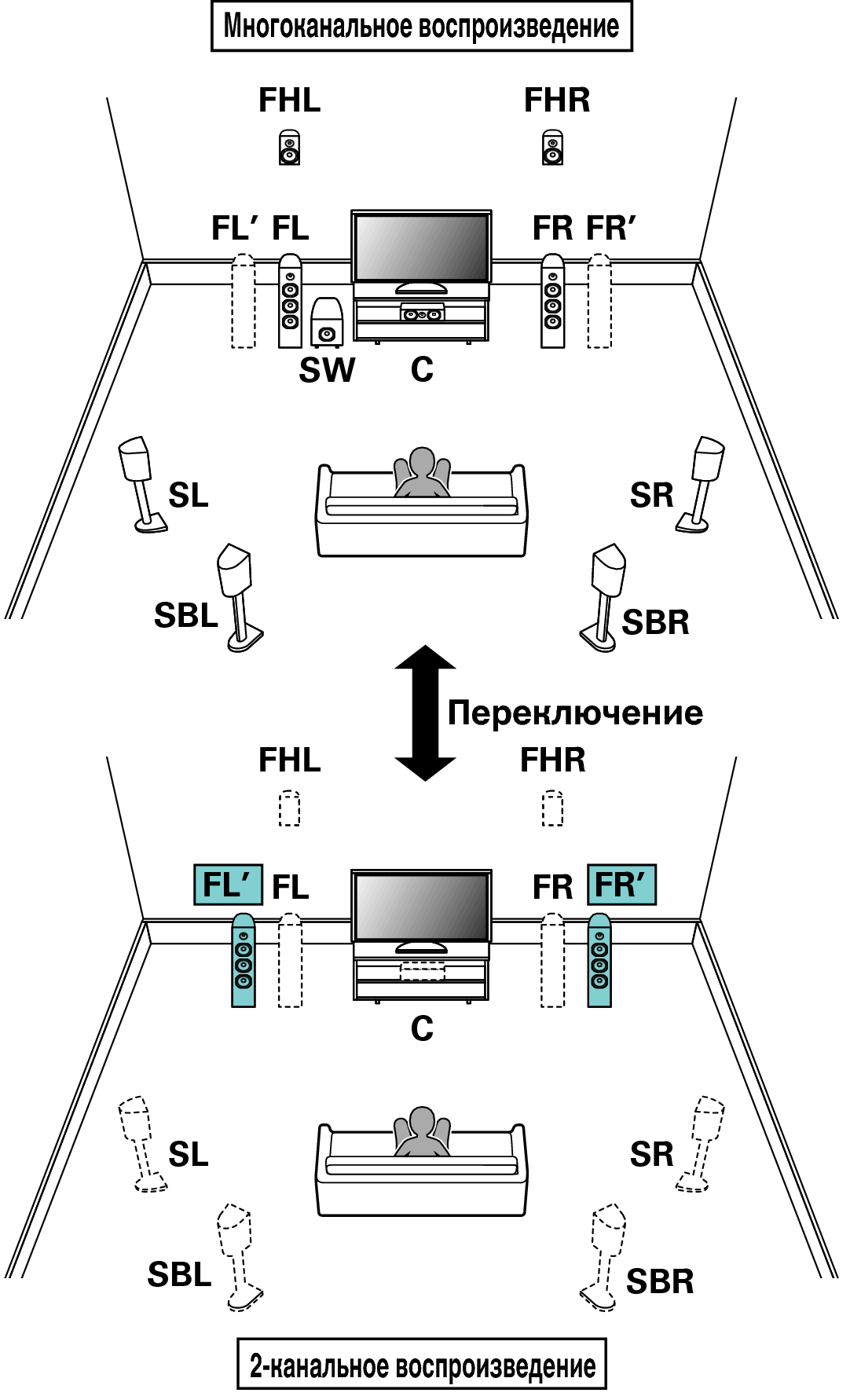 Вы можете подключить динамики, используемые только для 2-канального воспроизведения, которые используются для прямого и стереофонического режимов, и динамики, используемые только для 9.1-канального воспроизведения. Динамики, используемые исключительно для многоканального воспроизведения, и динамики, используемые исключительно для 2-канального воспроизведения, автоматически переключаются для воспроизведения в соответствии с режимом звука.