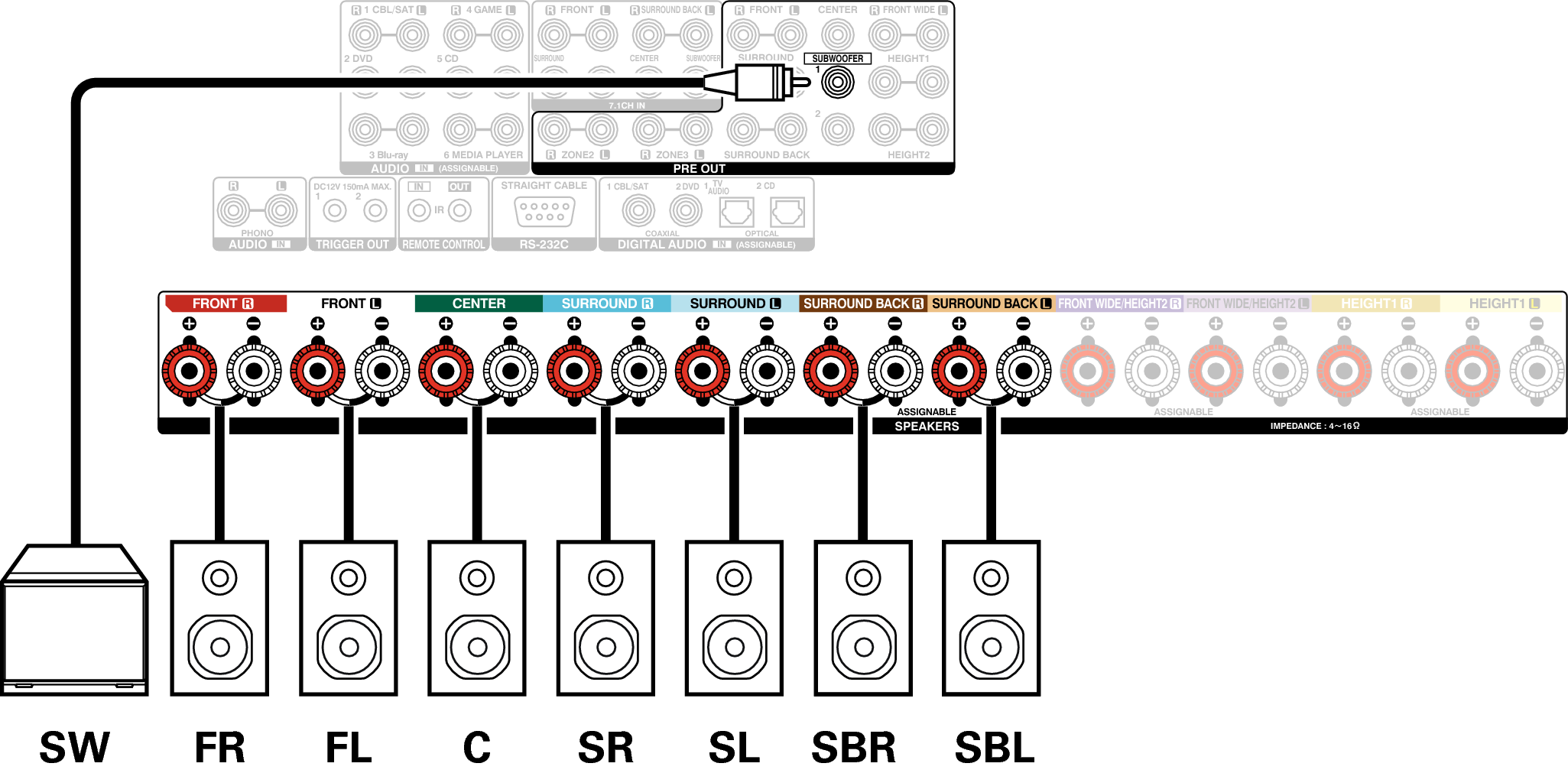 Данная система воспроизводит 7.1 каналов. Вы можете использовать подключение с двухполосным усилением для передних динамиков. Подключение с двухполосным усилением - метод подключения отдельных усилителей к разъемам ВЧ и НЧ динамика, который поддерживает двухполосное усиление. Данное подключение делает возможной противо-ЭДС (возврат питания без вывода) из НЧ-динамика в ВЧ-динамик без влияния на качество звука, производя более высокое качество звука.