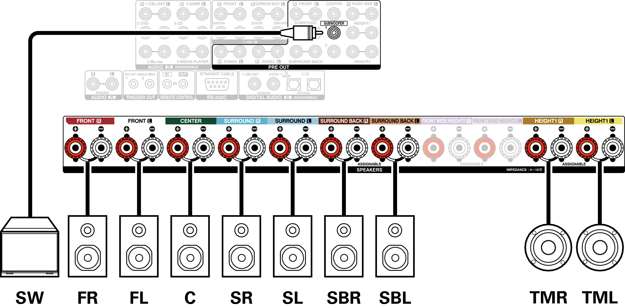 Вы можете подключить динамики максимум для 13 каналов для MAIN ZONE с помощью внешнего усилителя мощности. При подключении динамиков для 12 или более каналов воспроизводящие звук динамики автоматически переключатся в зависимости от входного сигнала и режима звука.