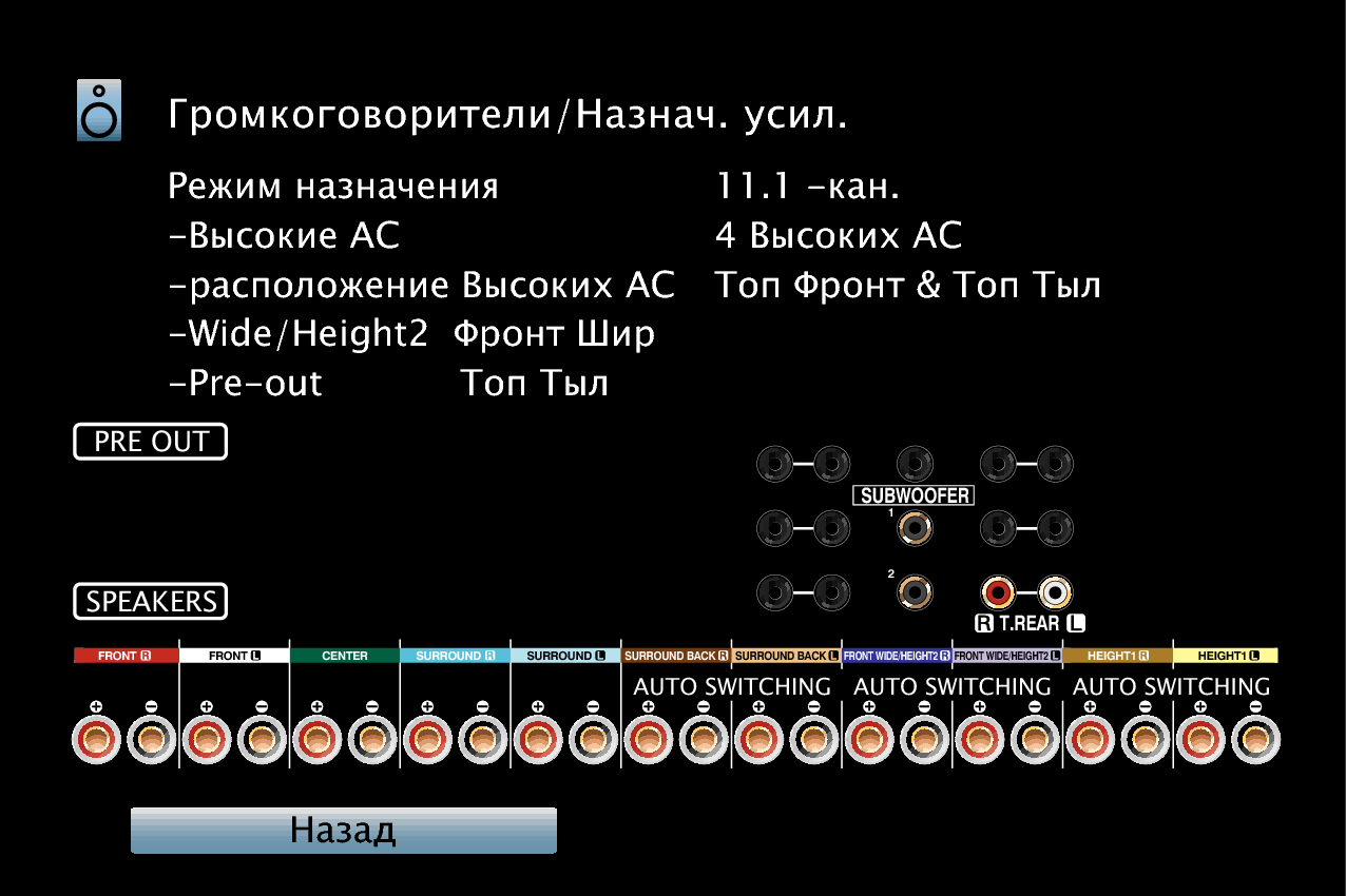Также см. экран меню в “Илл-я клемм АС” на экране настройки “Назнач. усил.”, который покажет, как выполнить подключения в Вашей обстановке.