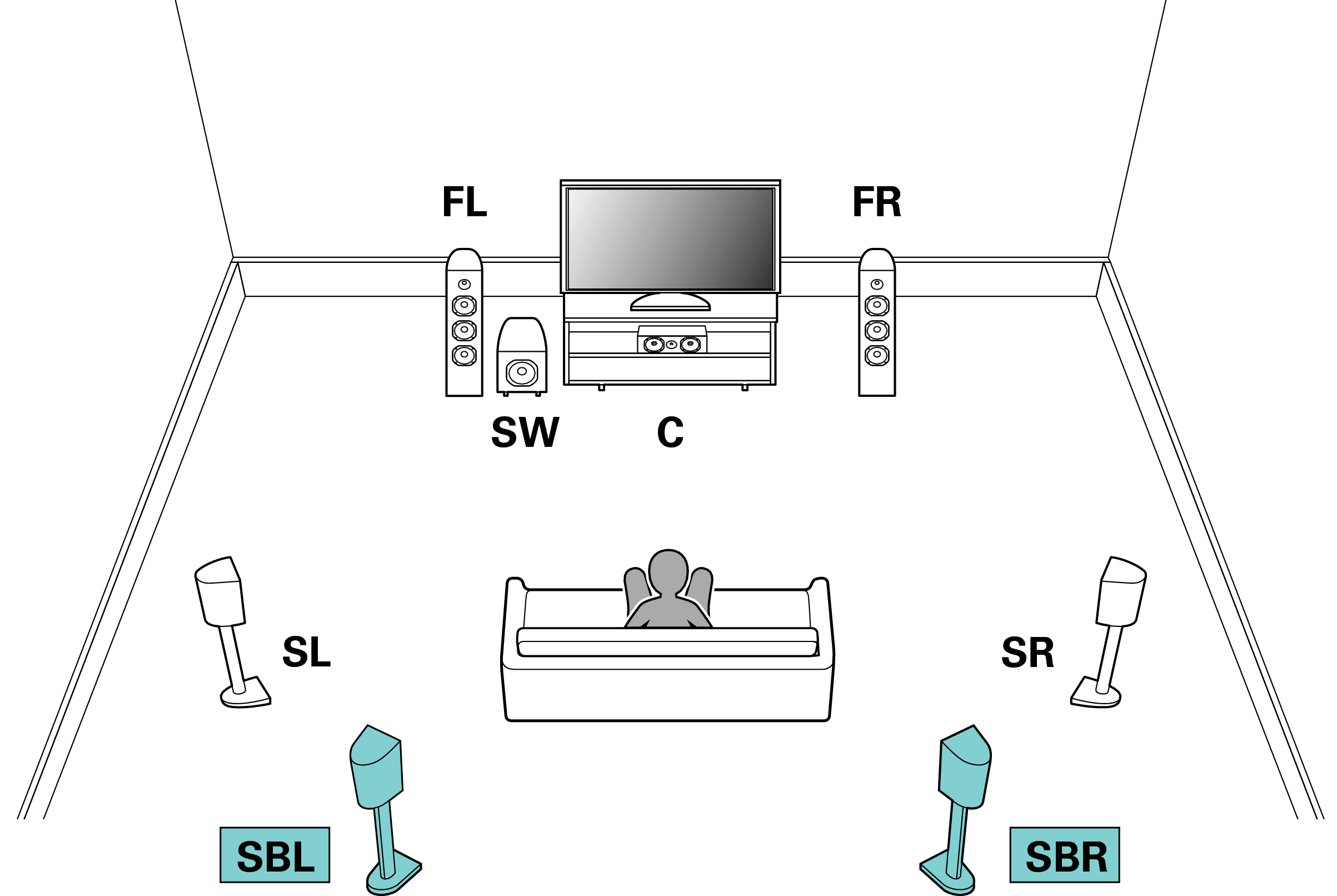 Данная система объемного звука 7.1-канальная такая же, как и основная 5.1-канальная система, но с задними объемными динамиками.