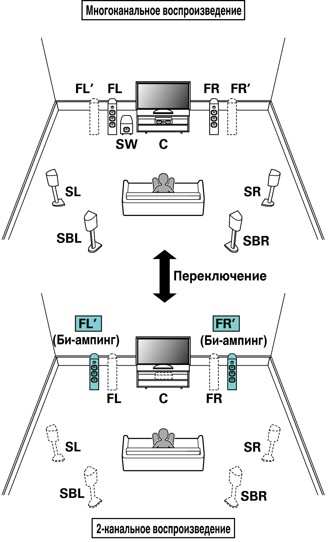 Вы можете подключить динамики, используемые только для 2-канального воспроизведения, которые используются для прямого и стереофонического режимов, и динамики, используемые только для 7.1-канального воспроизведения. Вы можете использовать подключение с двухполосным усилением для динамиков, используемых исключительно для 2-канального воспроизведения. Динамики, используемые исключительно для многоканального воспроизведения, и динамики, используемые исключительно для 2-канального воспроизведения, автоматически переключаются для воспроизведения в соответствии с режимом звука.