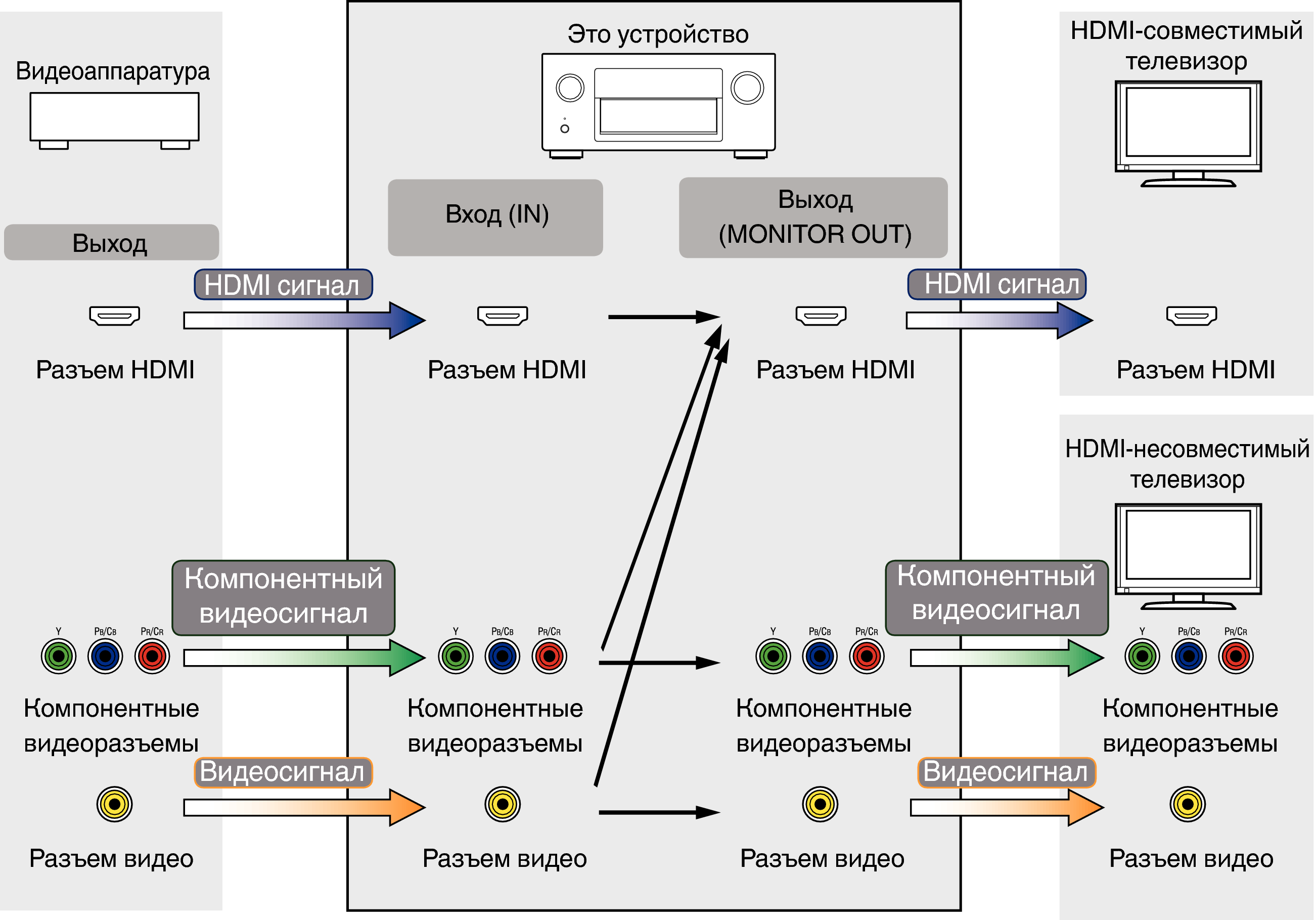 Данное устройство автоматически преобразует входные видеосигналы перед выводом на телевизор, как показано на схеме ниже.