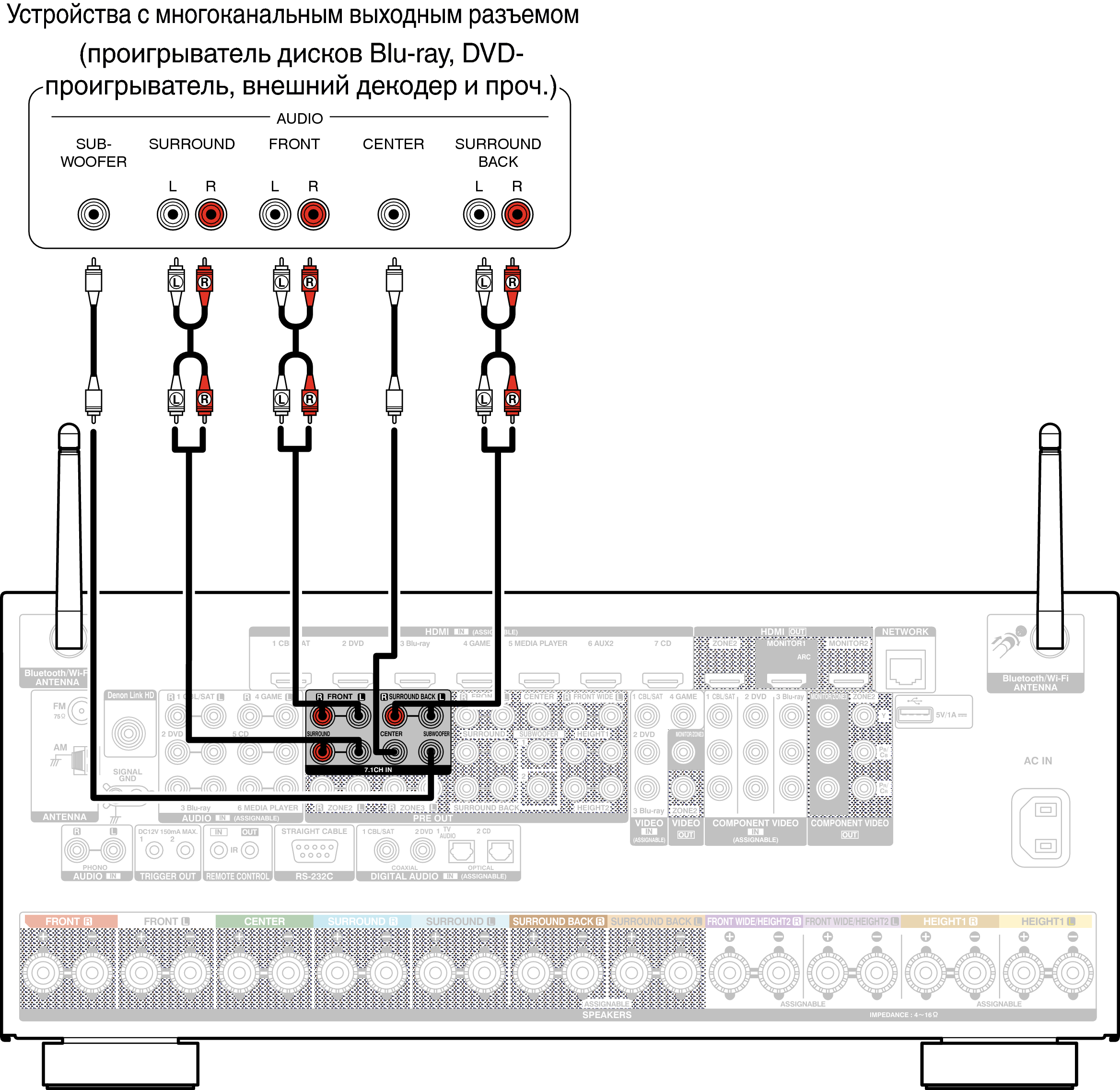 Для воспроизведения музыки и видеоконтента данное устройство можно подключить к внешнему устройству с выходными разъемами для многоканального звукового сигнала.