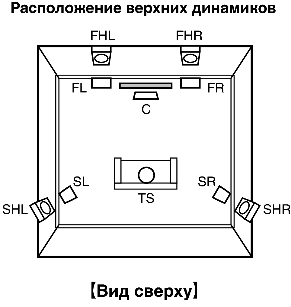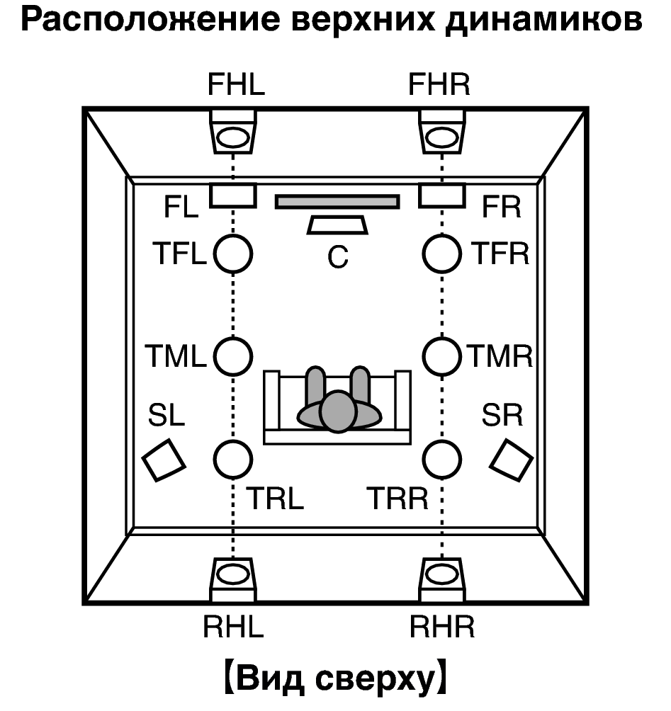 Для достижения наилучшего эффекта Auro-3D рекомендуется использовать верхние динамики объемного звучания, но можно также заменить верхние динамики объемного звучания тыловыми верхними динамиками.