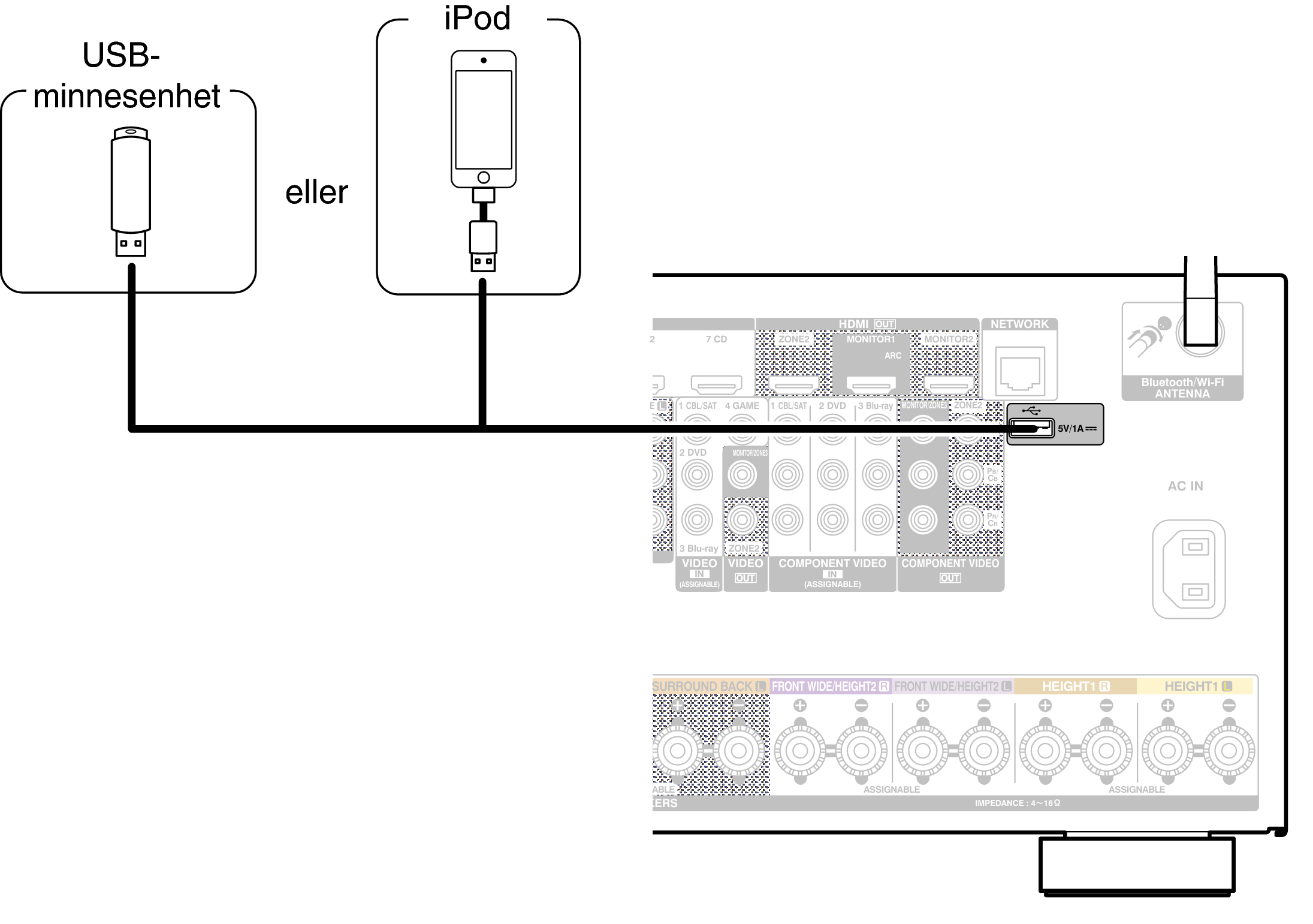 Denon kan inte garantera korrekt funktion eller strömförsörjning till alla USB-minnesenheter. När du använder en bärbar USB-hårddisk (HDD) som har levererats med nätadapter ska denna nätadapter användas i första hand.