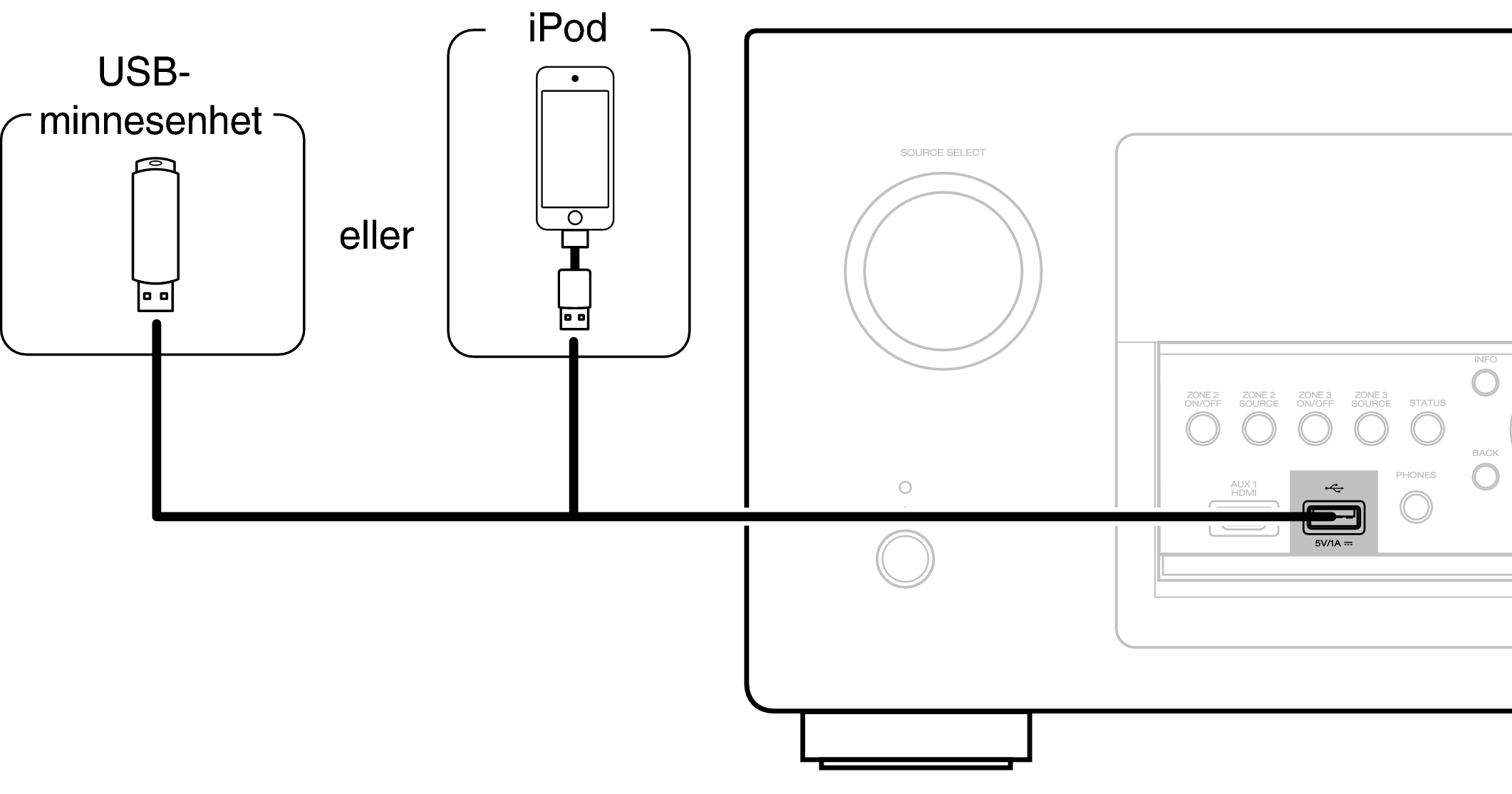 Anvisningar finns i “Spela upp från en iPod” länk eller “Spela från en USB-minnesenhet” länk.