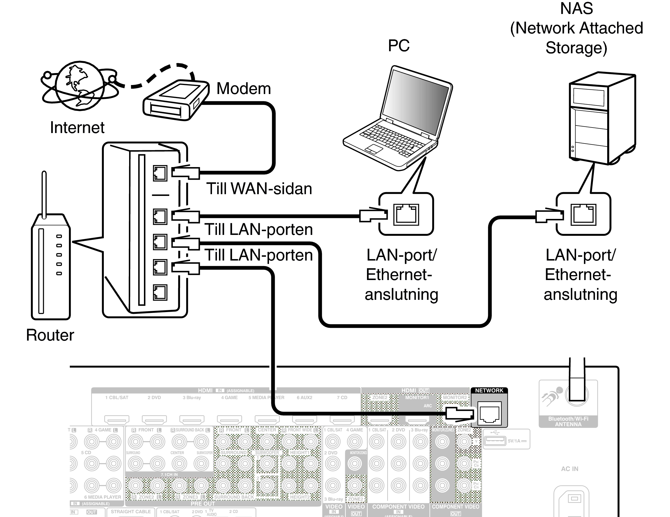 För att ansluta via trådanslutet LAN ska en LAN-kabel användas för att ansluta en router till den här enheten som bilden visar nedan.