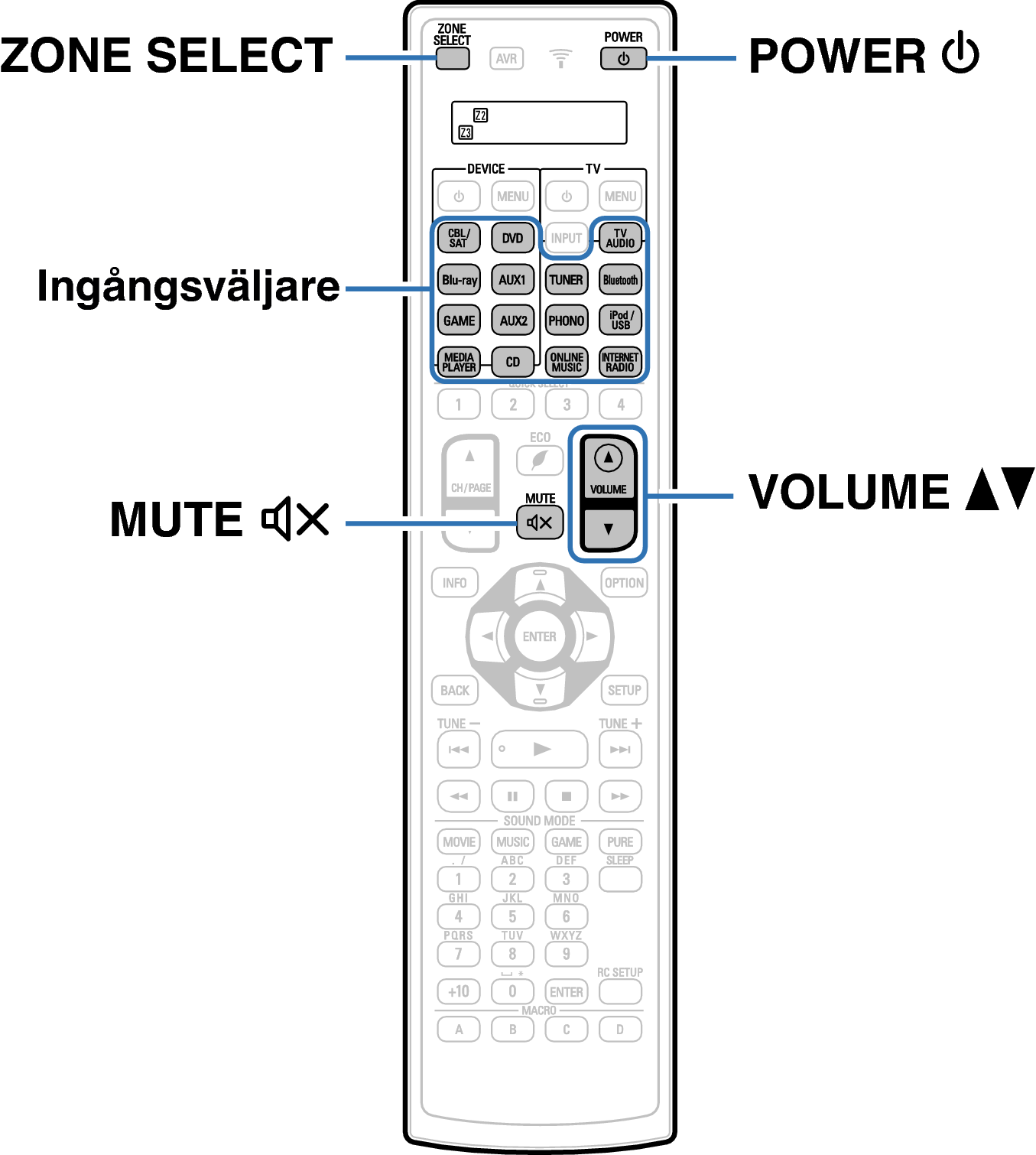 Strömmen till ZONE2 eller ZONE3 kan slås på och av genom att trycka på ZONE2 ON/OFF eller ZONE3 ON/OFF på huvudenheten.