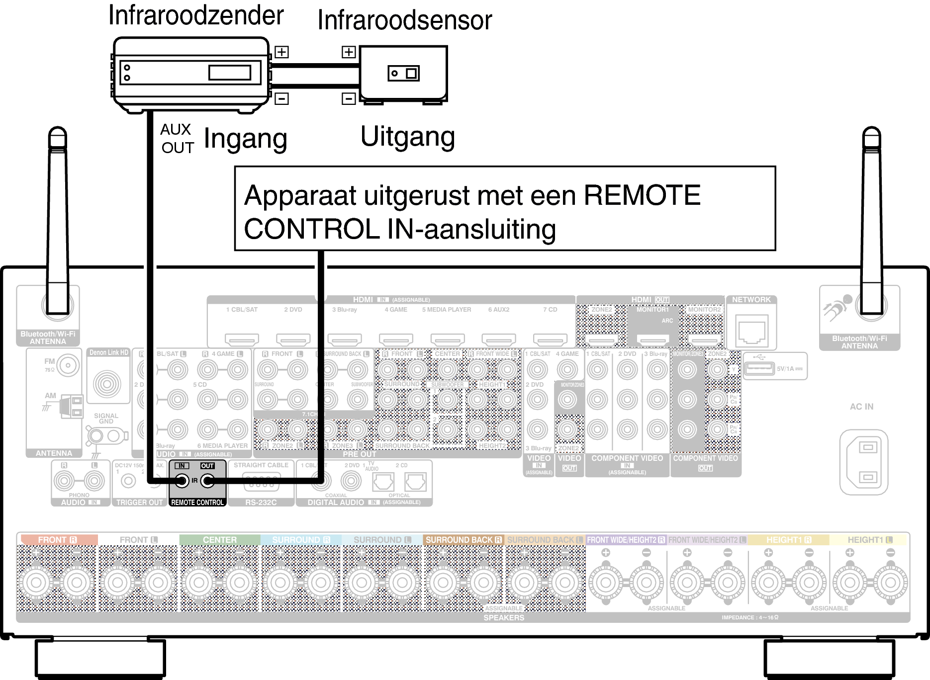 Wanneer dit toestel wordt geïnstalleerd op een locatie waar de afstandsbedieningssignalen geen bereik hebben (installatie in een kast enz.), kan het nog steeds via de afstandsbediening worden gebruikt door een ontvangereenheid van de afstandsbediening aan te sluiten (afzonderlijk verkrijgbaar).