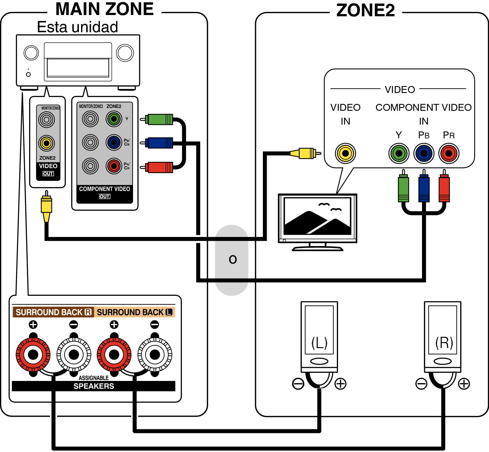 Cuando conecte un televisor al conector HDMI ZONE2 OUT, y la zona principal y ZONE2 se ajusten a la misma fuente de entrada, el audio MAIN ZONE podría ser mezclado con el audio de 2 canales.