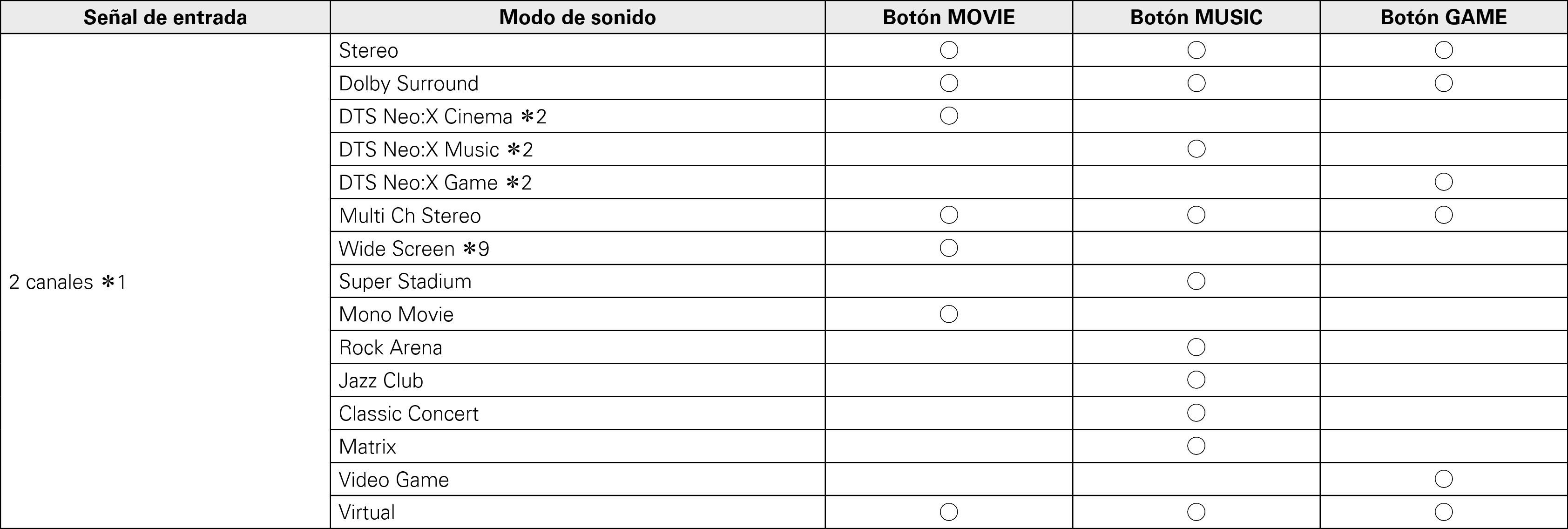 Lleva a cabo la reproducción estéreo cuando la señal de entrada es PCM. Cuando la señal de entrada es Dolby Digital o DTS, la música se reproduce de acuerdo al número de canal respectivo.