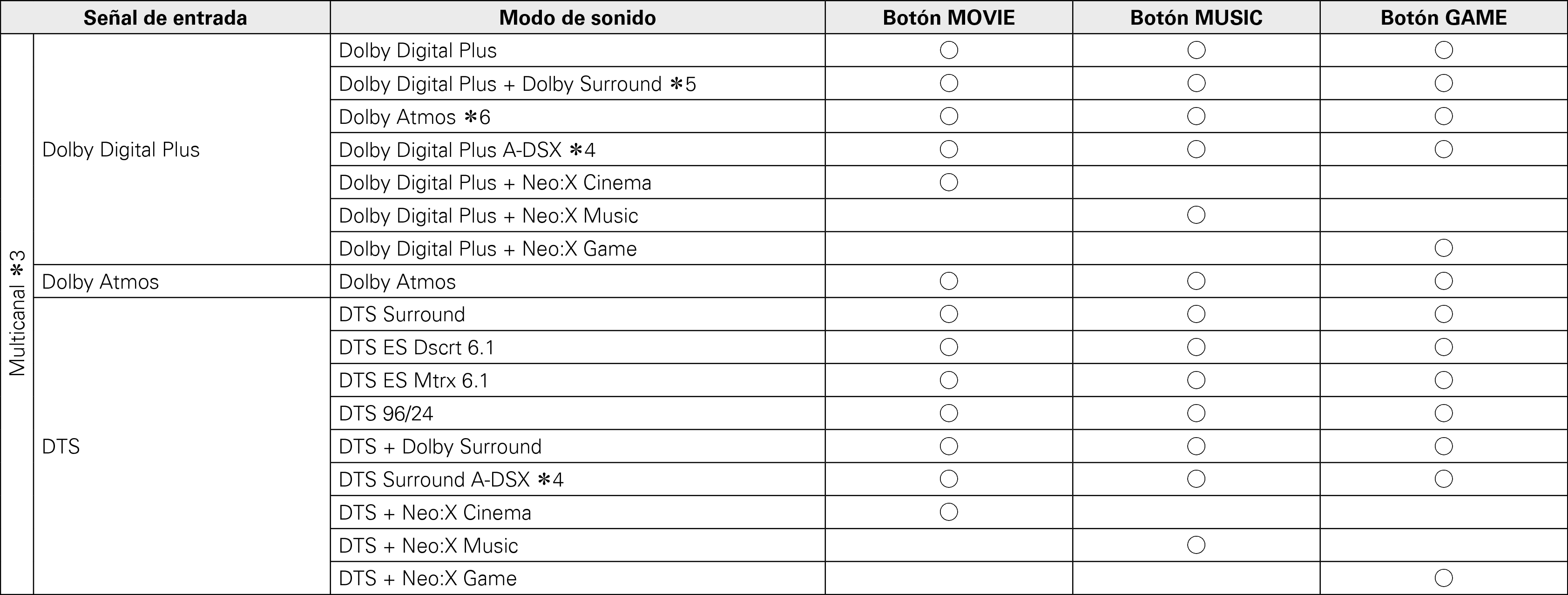 En este modo se detecta el tipo de señal de entrada digital, como Dolby Digital, Dolby TrueHD, Dolby Digital Plus, Dolby Digital EX, Dolby Atmos, DTS, DTS-HD, DTS:X, DTS-ES, PCM (multicanal), y el modo de reproducción cambia automáticamente al modo que corresponda.