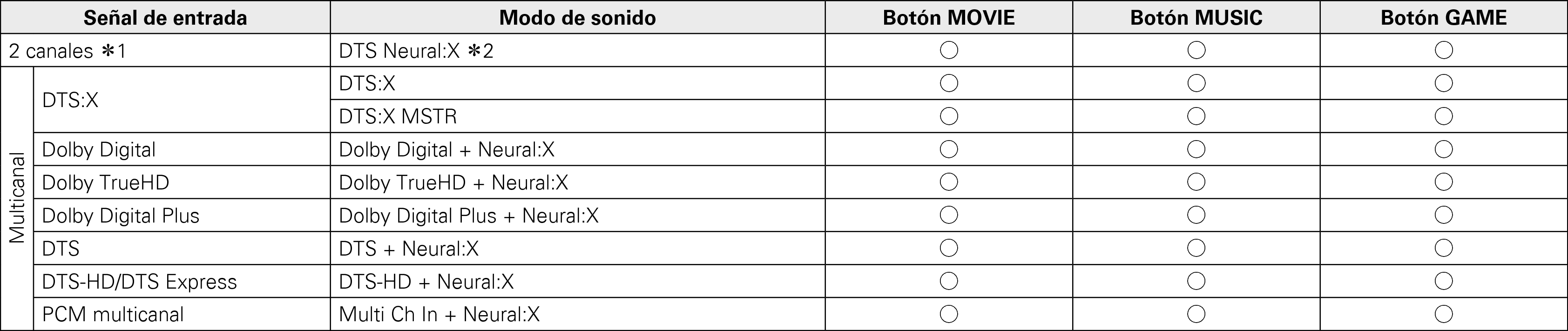 Si la señal de entrada es analógica o PCM (2 canales), se emplea la reproducción estéreo. Con Dolby Digital o DTS, la música se reproduce de acuerdo al número de canal respectivo.