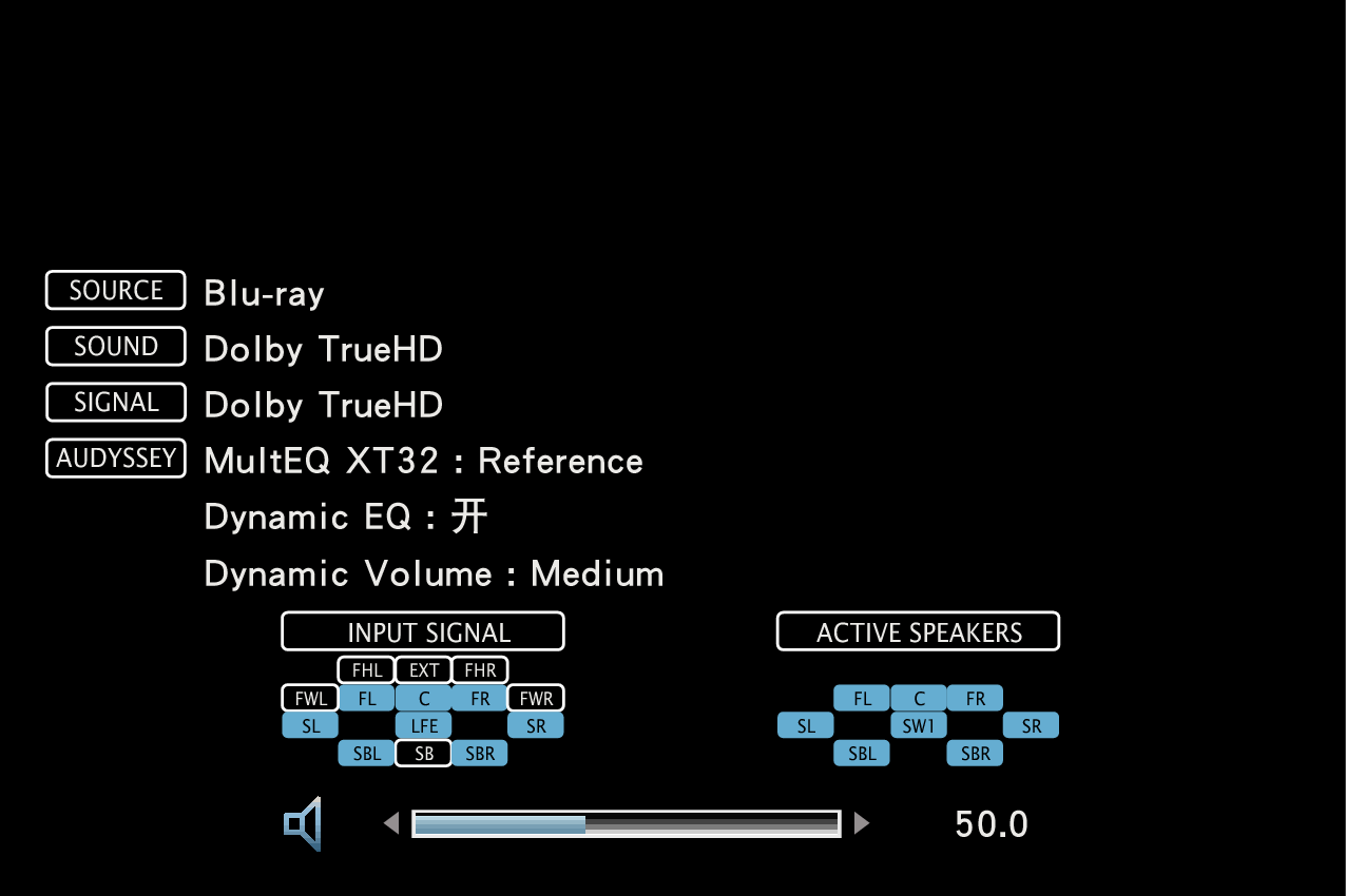 按遥控器的INFO键以后,将在屏幕下端显示当前源名称、音量及声音模式等。