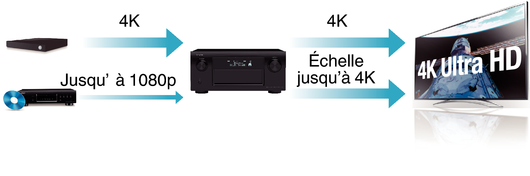 Lorsque 4K Ultra HD (High Definition) est utilisé, une vitesse d’entrée/sortie de 60 images par seconde (60p) est obtenue pour les signaux vidéo. Lorsque vous êtes connecté à l’entrée d’un signal vidéo d’une TV compatible 4K Ultra HD et 60p, vous pouvez profiter du sens du réalisme disponible uniquement à partir d’images en haute définition, même en visualisant une vidéo en mouvement rapide.