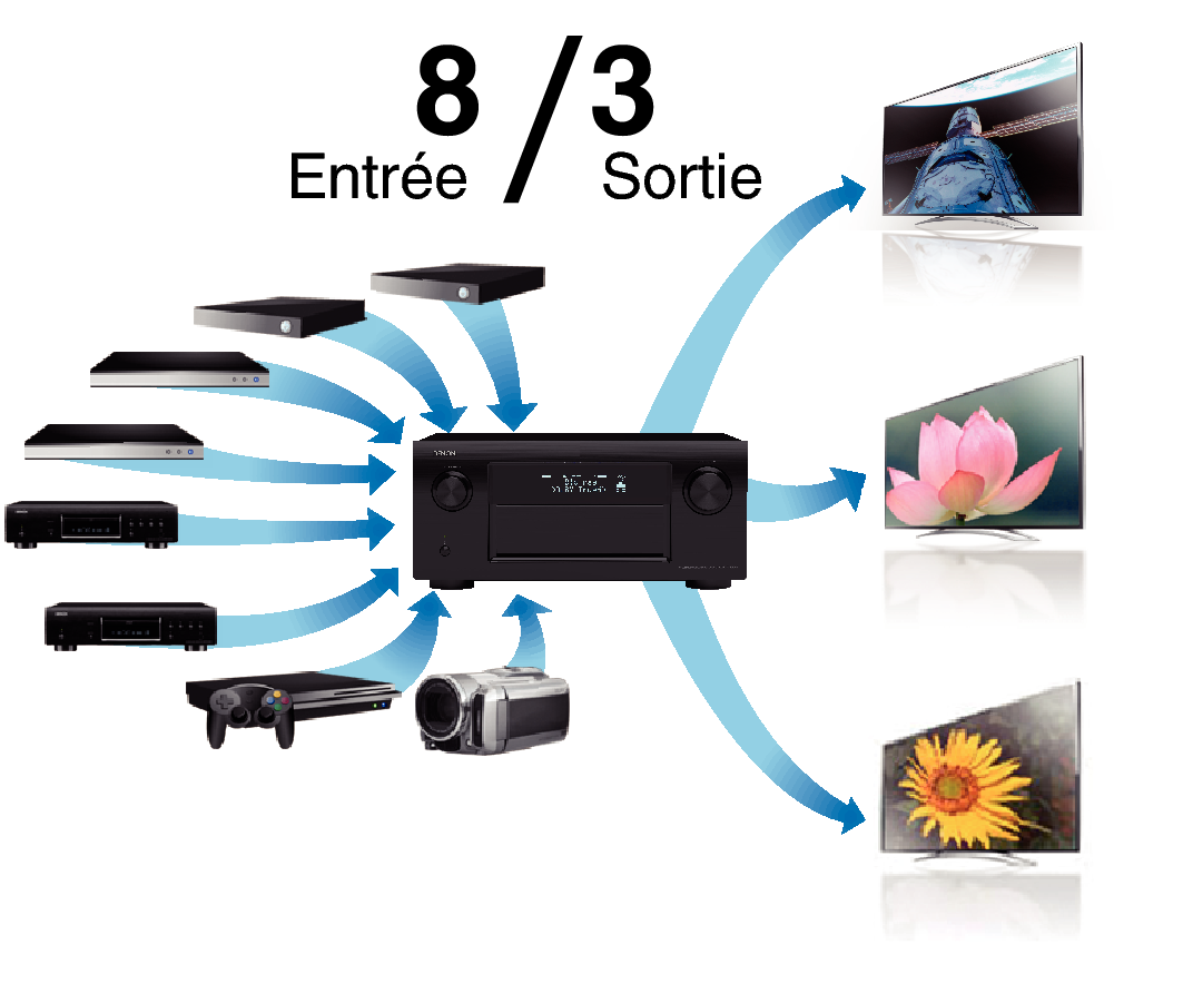 Les connexions HDMI permettent la connexion à divers appareils AV numériques (8 entrées, 3 sortie)