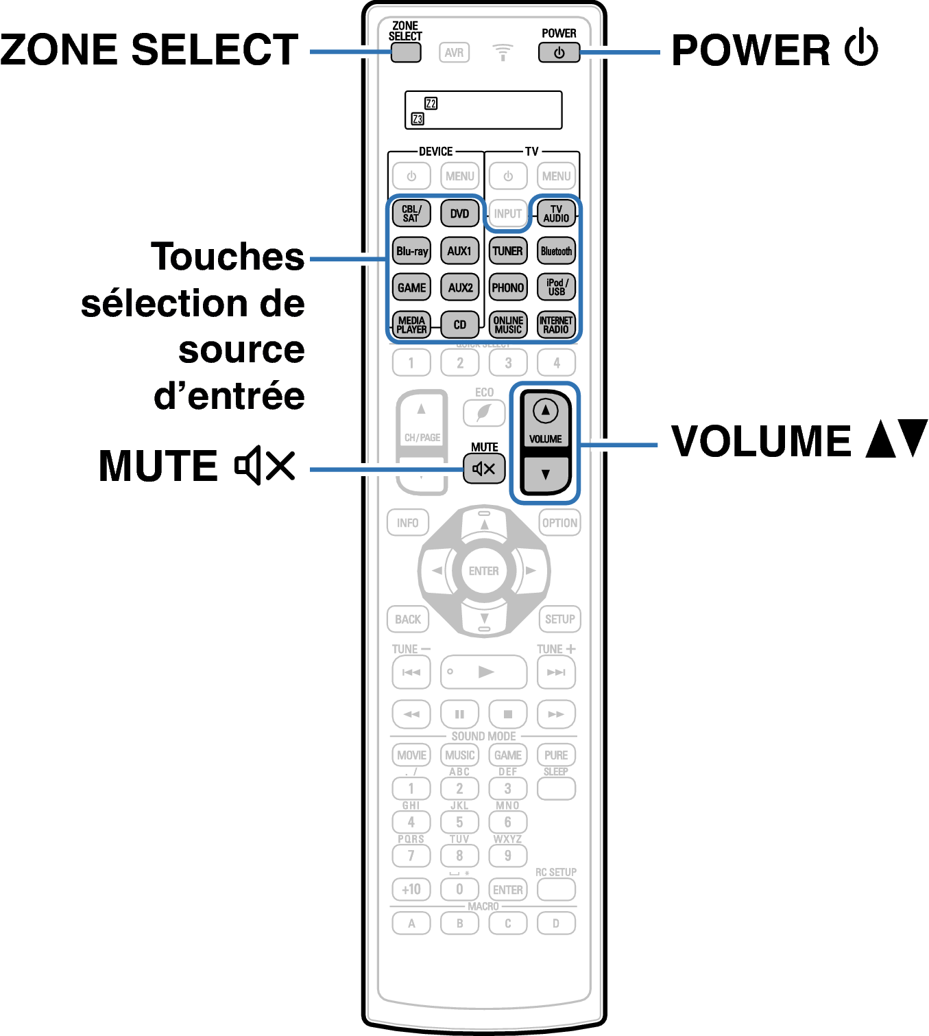 l est possible de mettre sous tension et hors tension la ZONE2 ou ZONE3 en appuyant sur ZONE2 ON/OFF ou ZONE3 ON/OFF directement sur l’appareil.