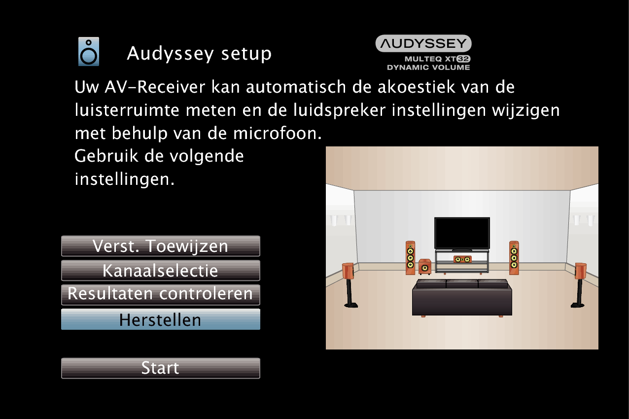 Als u “Herstellen” instelt op “Herstellen”, kunt u terugkeren naar het meetresultaat van de Audyssey® setup (waarde berekend bij de start via MultEQ® XT32), zelfs als u elke instelling handmatig hebt gewijzigd.