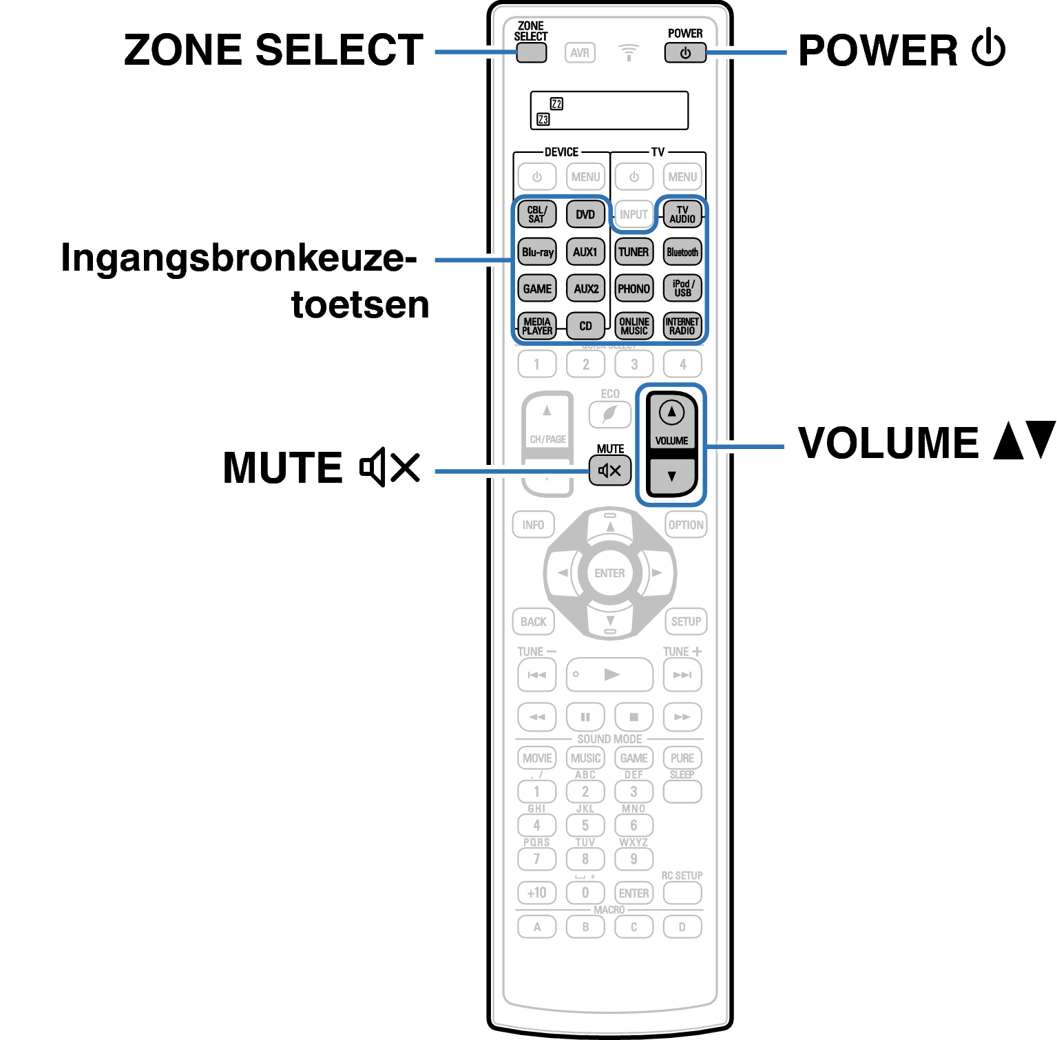Voor het uitvoeren van een bediening met het hoofdtoestel, moet u herhaaldelijk op ZONE2 SOURCE of ZONE3 SOURCE drukken. Telkens wanneer u op ZONE2 SOURCE of ZONE3 SOURCE drukt, verandert de ingangsbron.