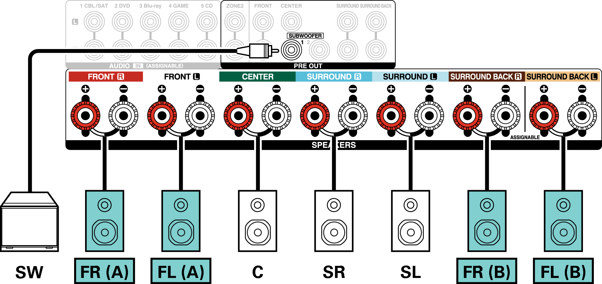 Anschluss von 5.1-Kanal-Lautsprechern: Zweites Front-Lautsprecherpaar
