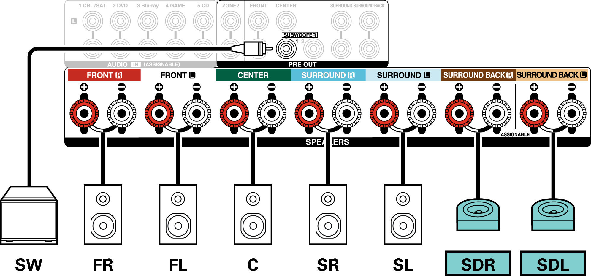 Wenn Sie nur einen Surround-Back-Lautsprecher verwenden, schließen Sie ihn am Anschluss SURROUND BACK L an.