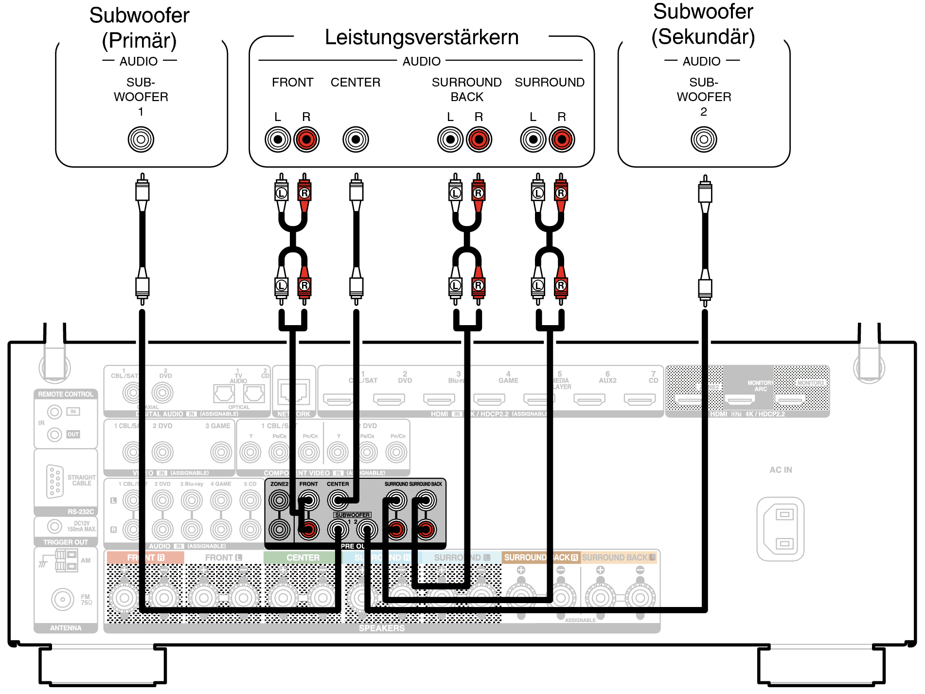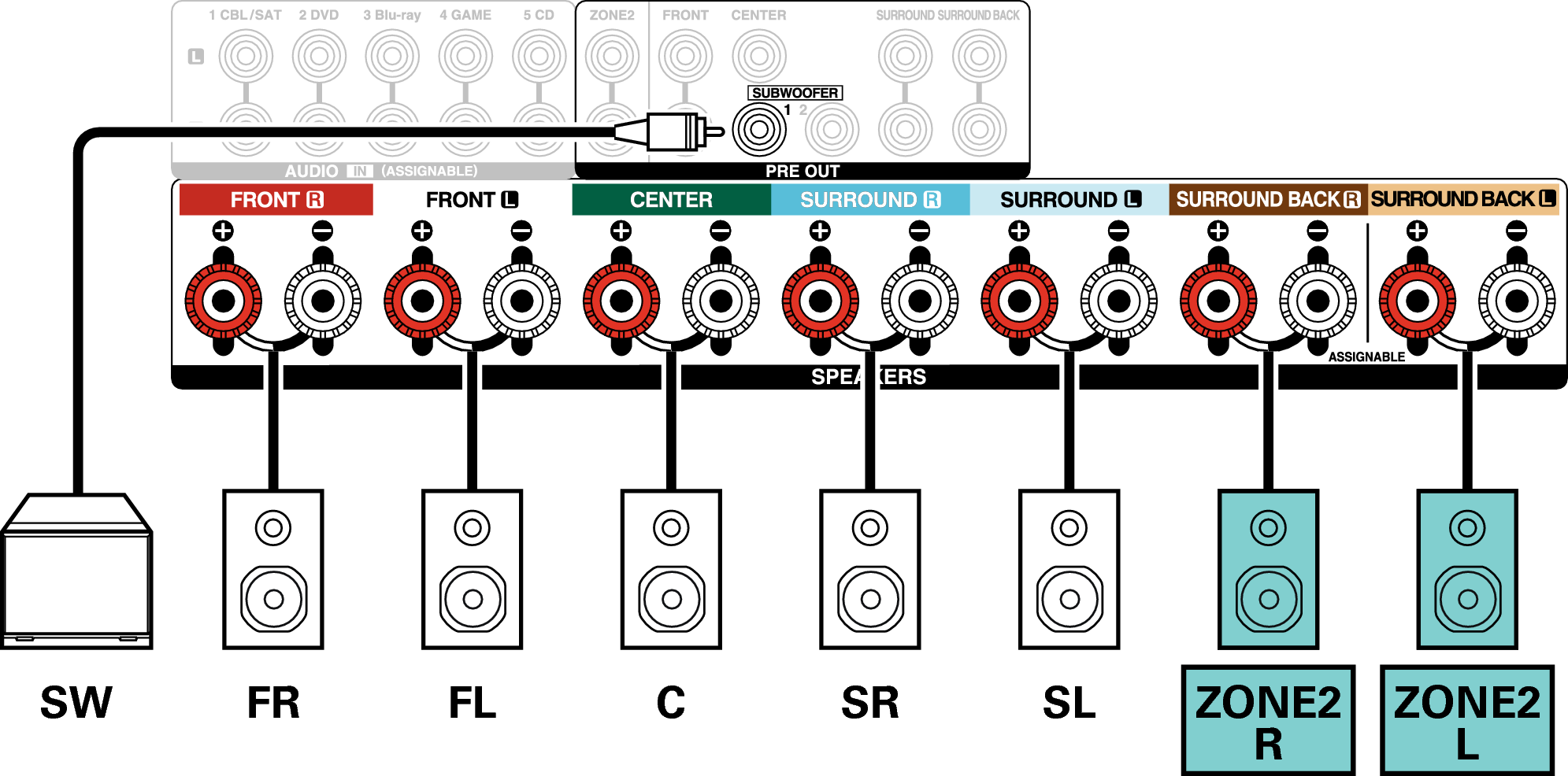 Lautsprecheranschluss 5.1-Kanal (MAIN ZONE) + 2-Kanal (ZONE2)