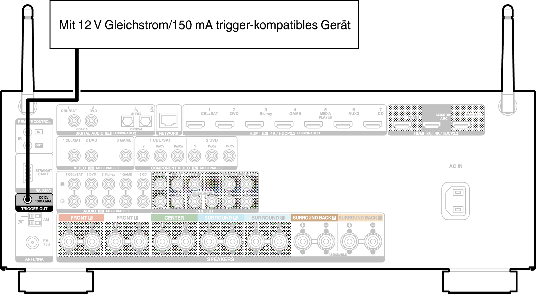 Wenn ein Gerät mit TRIGGER IN-Buchsen angeschlossen ist, lässt sich die Einschalt-/Standby-Funktion des jeweiligen Geräts über dieses Gerät durch die Gerätekopplung betätigen.