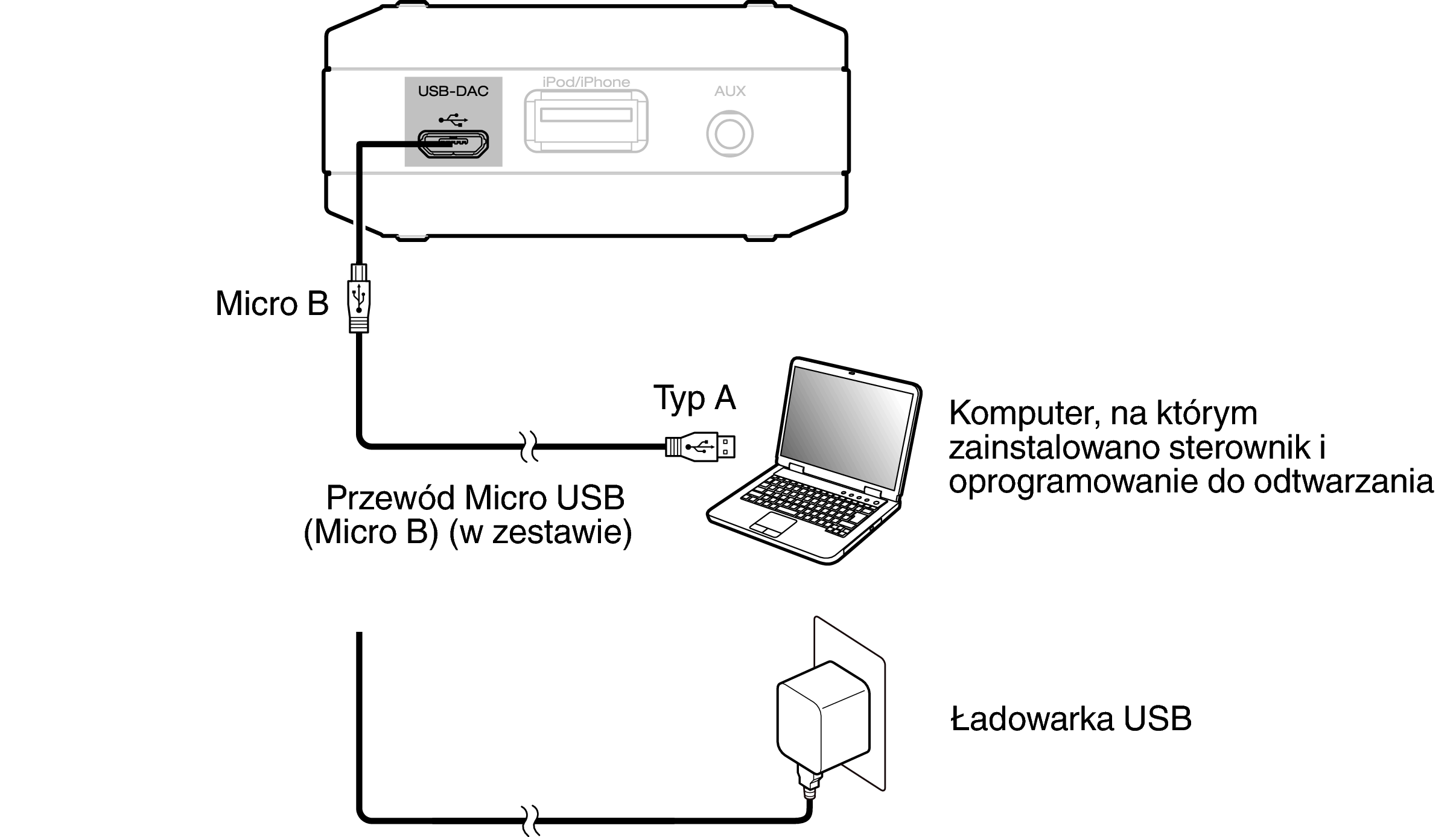 Urządzenie należy podłączyć bezpośrednio do komputera. Jeśli urządzenie zostanie podłączone przez koncentrator USB itp., może nie być ładowane prawidłowo.