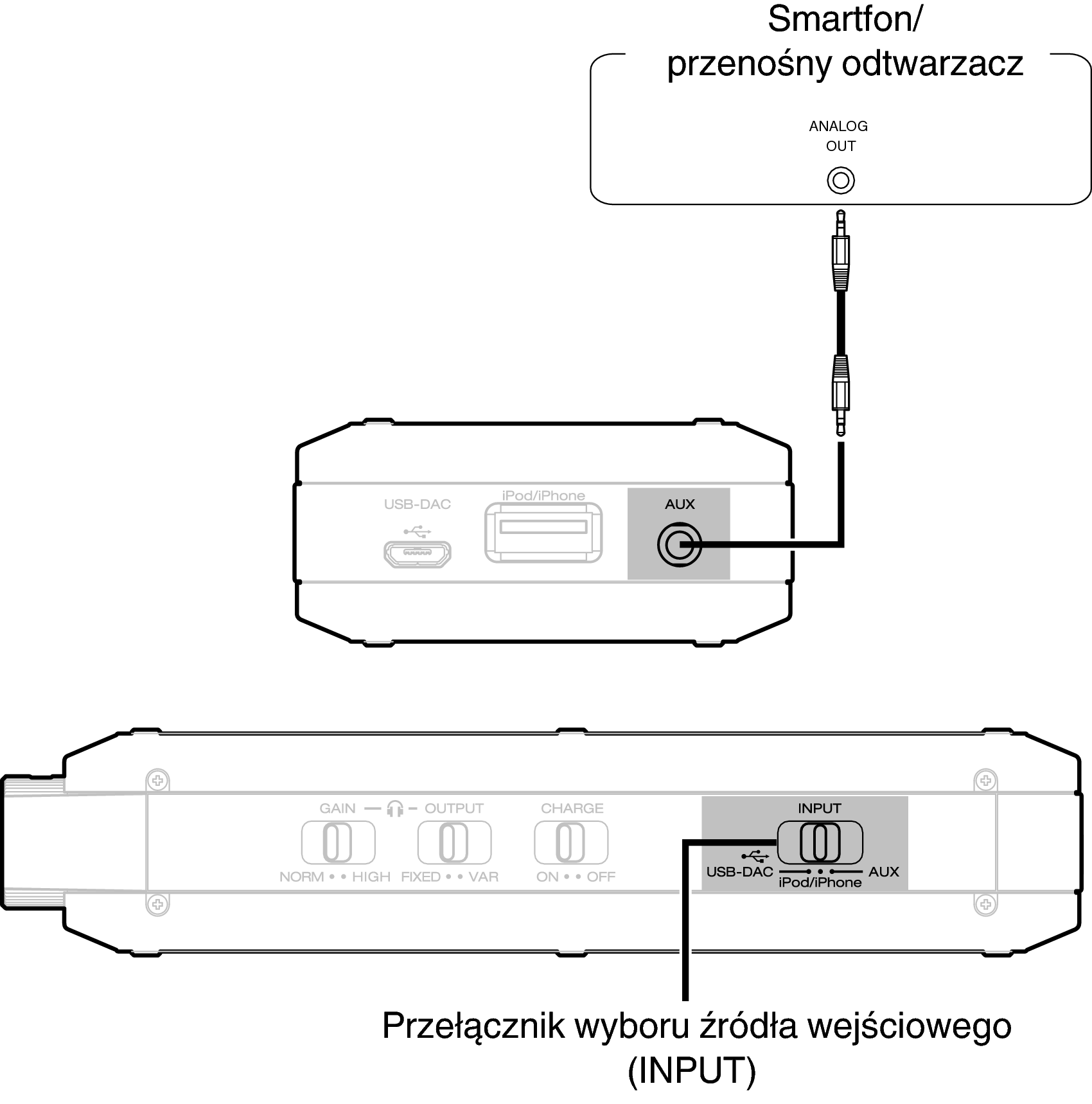 Ustaw przełącznik wyboru źródła wejściowego (INPUT) w pozycji AUX.