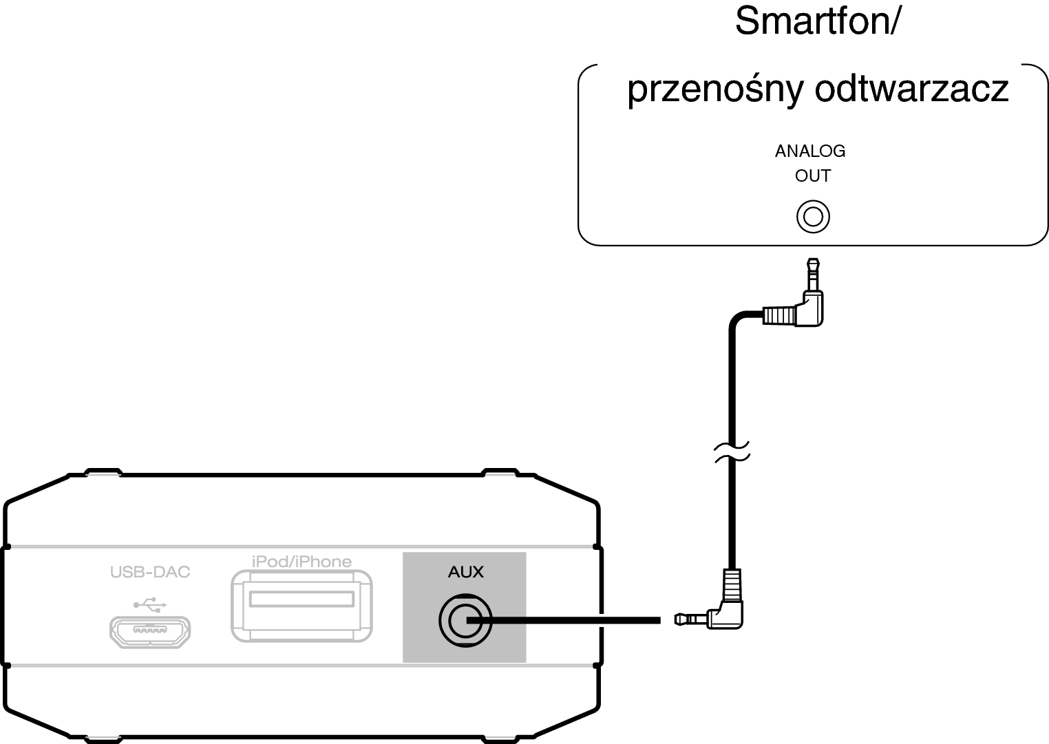 Podłączając przewód z wtyczką mini stereo (w zestawie) do złącza wejściowego AUX tego urządzenia oraz do złącza wyjściowego audio smartfona lub przenośnego odtwarzacza, można odtwarzać muzykę z podłączonego urządzenia.