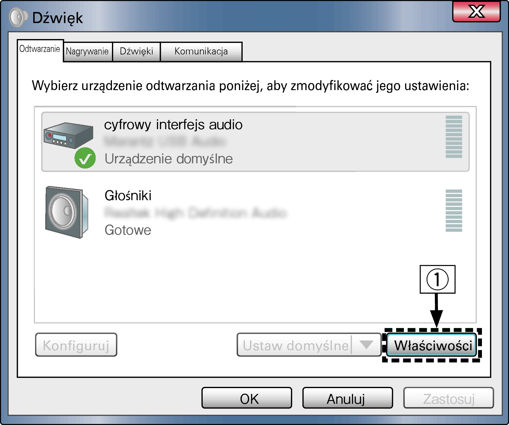 Jeśli symbol zaznaczenia widnieje obok innego urządzenia, kliknij Denon USB Audio i “Ustaw domyślne”.