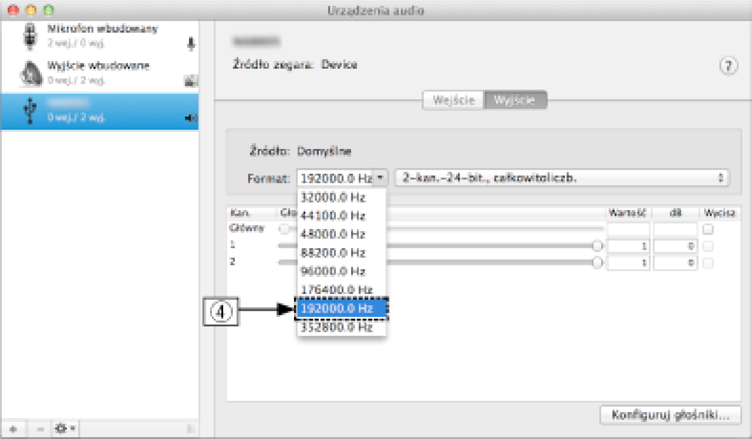 Zwykle rekomenduje się, aby format został ustawiony na “192000.0 Hz” i “2-kan.-24bit., całkowitoliczb.”.