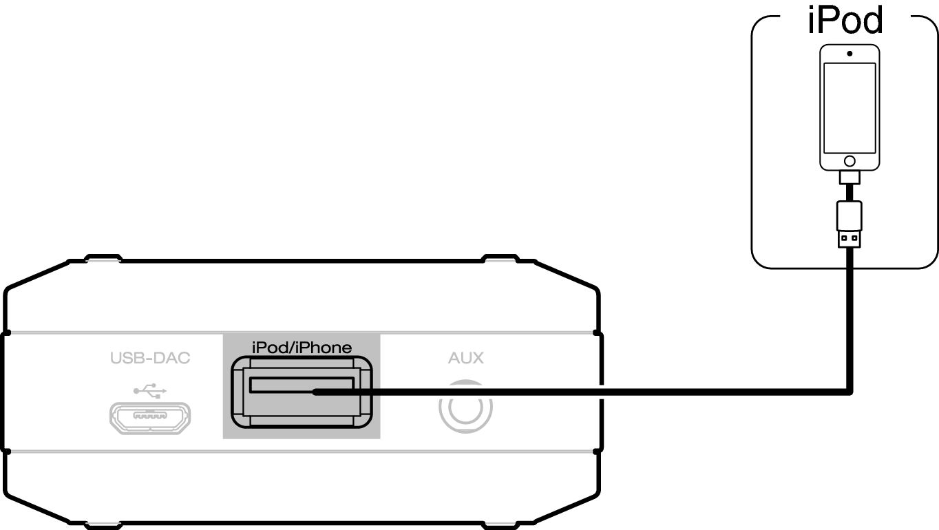 Du kan använda USB-kabeln som följer med den här enheten eller den som följer med din iPod för att ansluta iPoden till enhetens iPod/iPhone-port och lyssna på musik som finns sparad på iPoden.