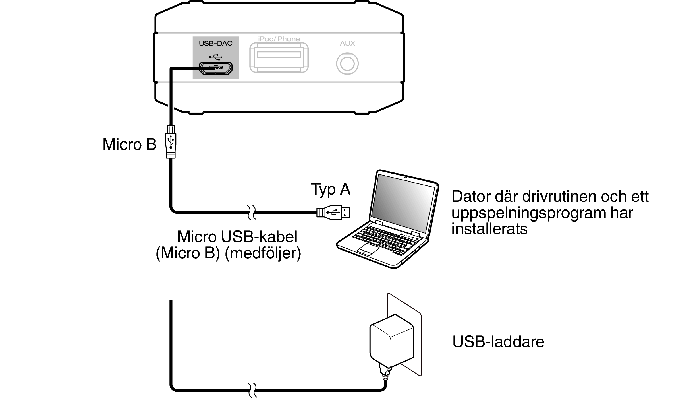 Anslut inte enheten till annan laddningsspänning än 5 V.