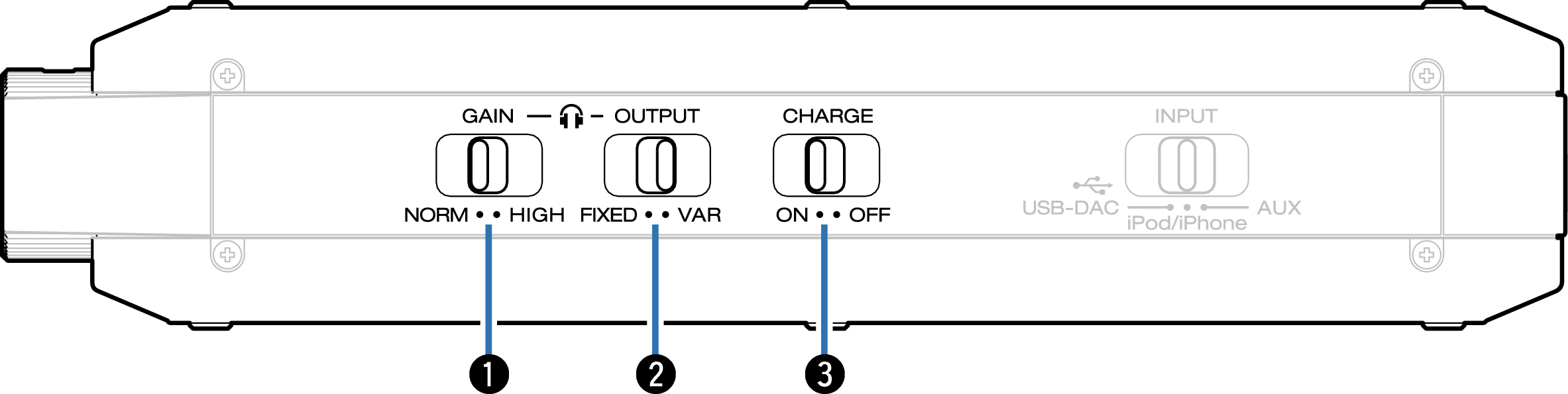 Med den här byter du förstärkningsnivå för hörlurarna. Ställ in detta efter de anslutna hörlurarna. Det är lämpligt att du först använder “NORM” och sedan byter till “HIGH” om volymen är för låg.