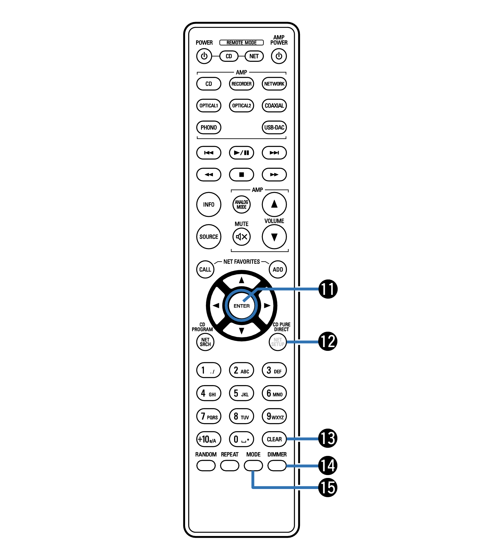 Für die Bedienung von Denon-Netzwerk-Audio-Playern drücken Sie auf REMOTE MODE NET, um die Fernbedienung in den Betriebsmodus für Netzwerk-Audio-Player umzuschalten.