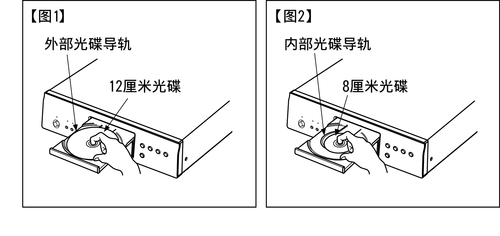 平整放置光碟,将12厘米光碟放置在外部光碟导轨上(图1),将8厘米光碟放置在内部光碟导轨上(图2)。
