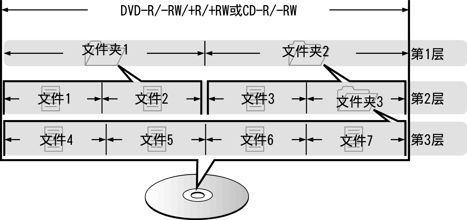 CD-R/-RW和DVD-R/-RW/+R/+RW上录制的音乐文件分成大区块(文件夹)和小区块(文件)。