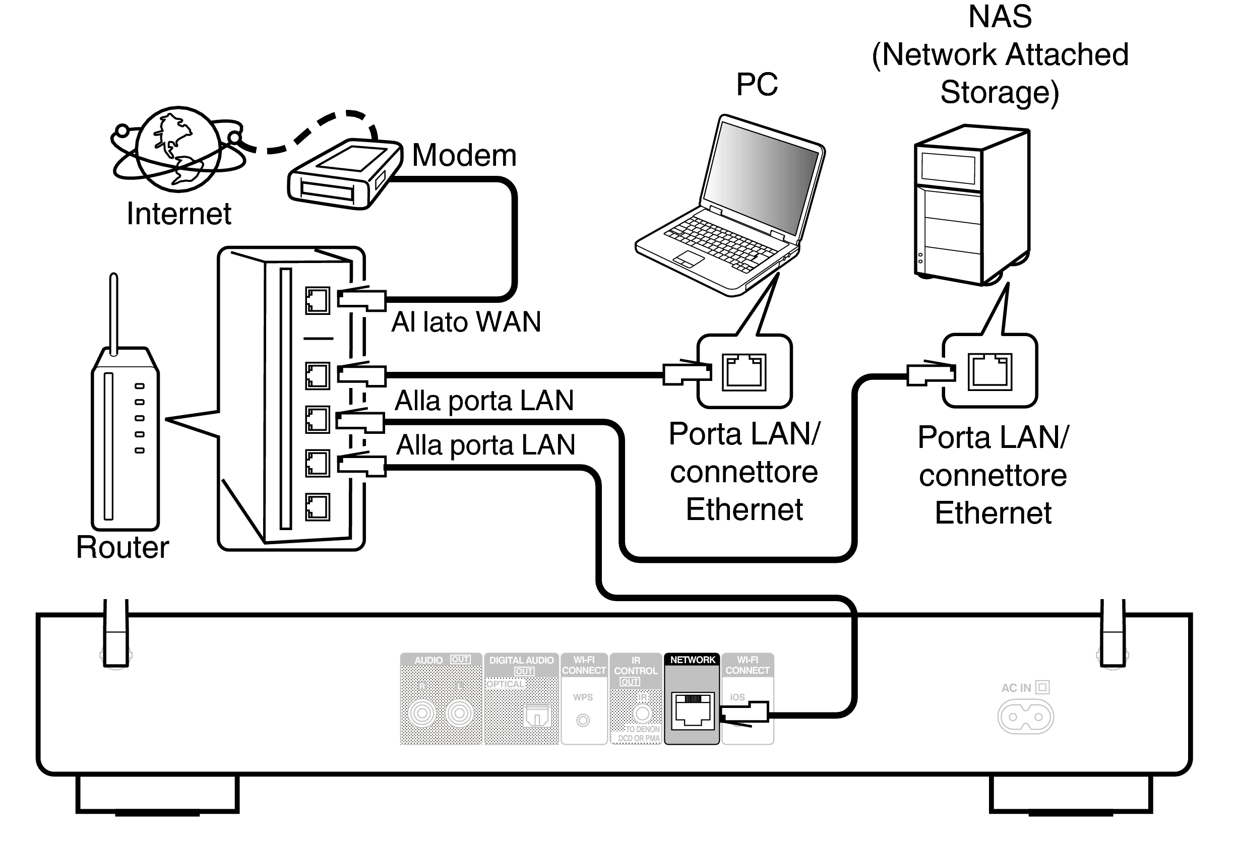 Per effettuare il collegamento tramite una LAN cablata, usare un cavo LAN per collegare il router a questa unità come mostrato nella figura di seguito.