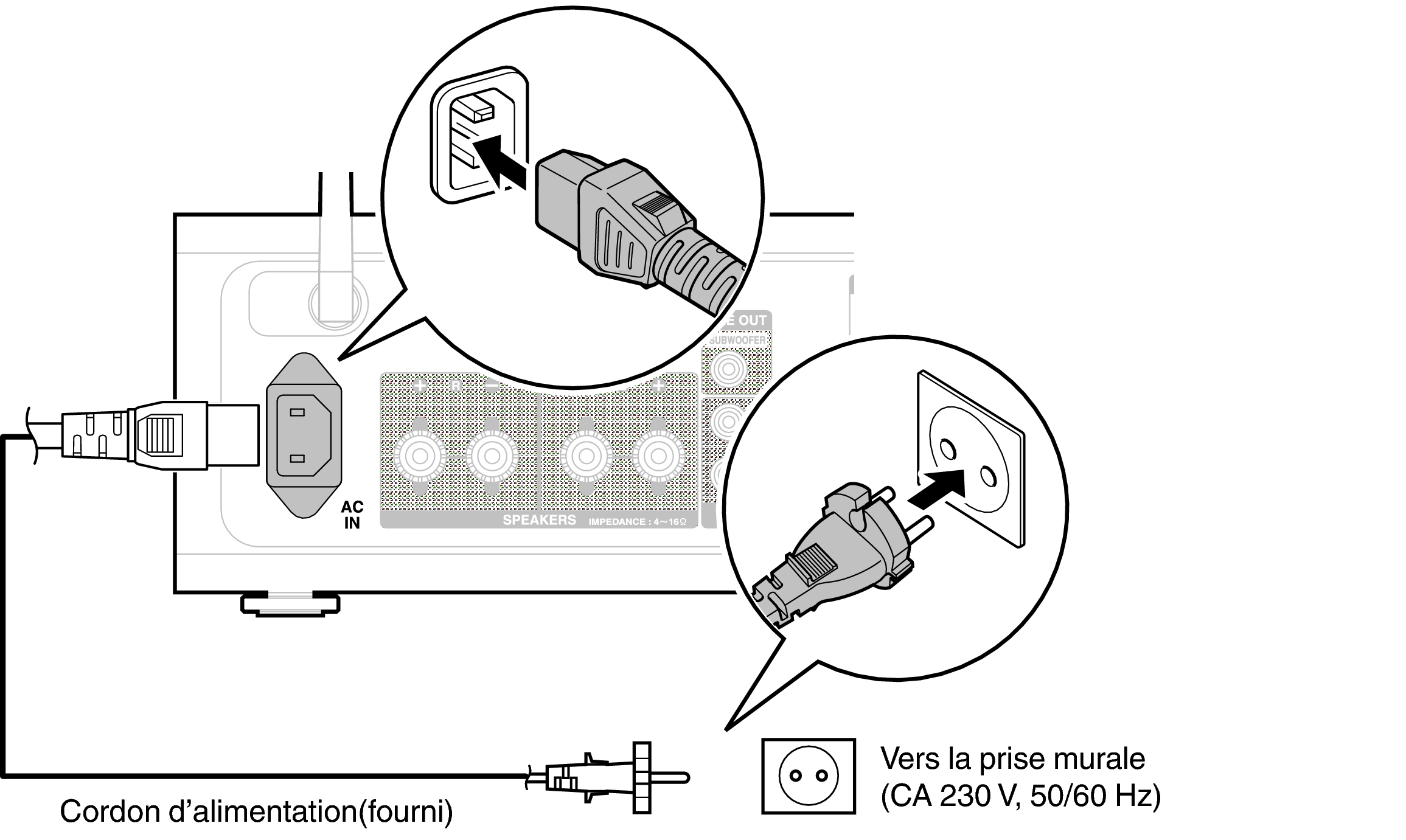 Une fois toutes les connexions effectuées, insérez la fiche d’alimentation dans la prise murale.