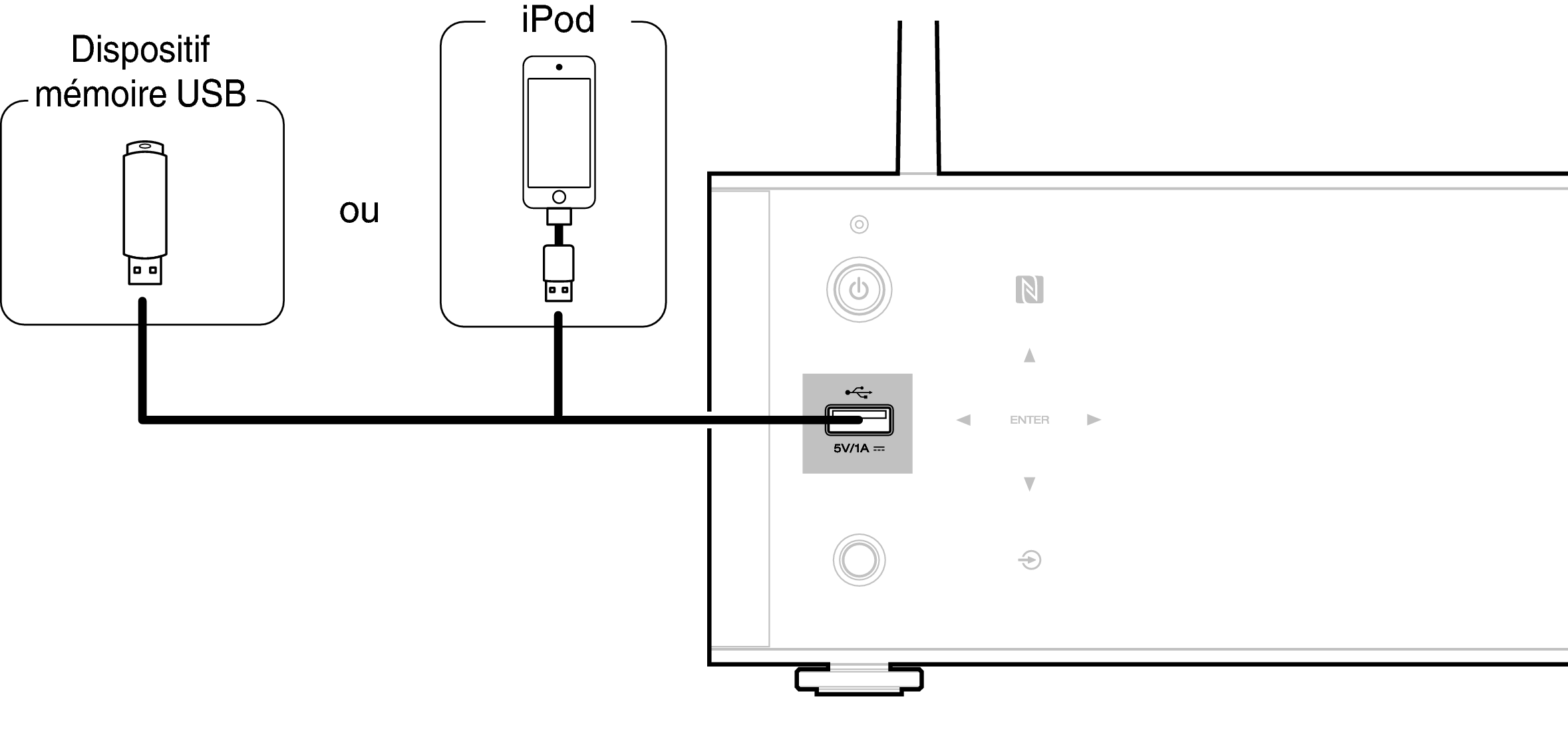 Denon ne garantit pas que tous les dispositifs mémoire USB fonctionnent ou soient alimentés. Lorsque vous utilisez un disque dur USB portable livré avec un adaptateur secteur, utilisez l’adaptateur secteur fourni avec cet appareil.